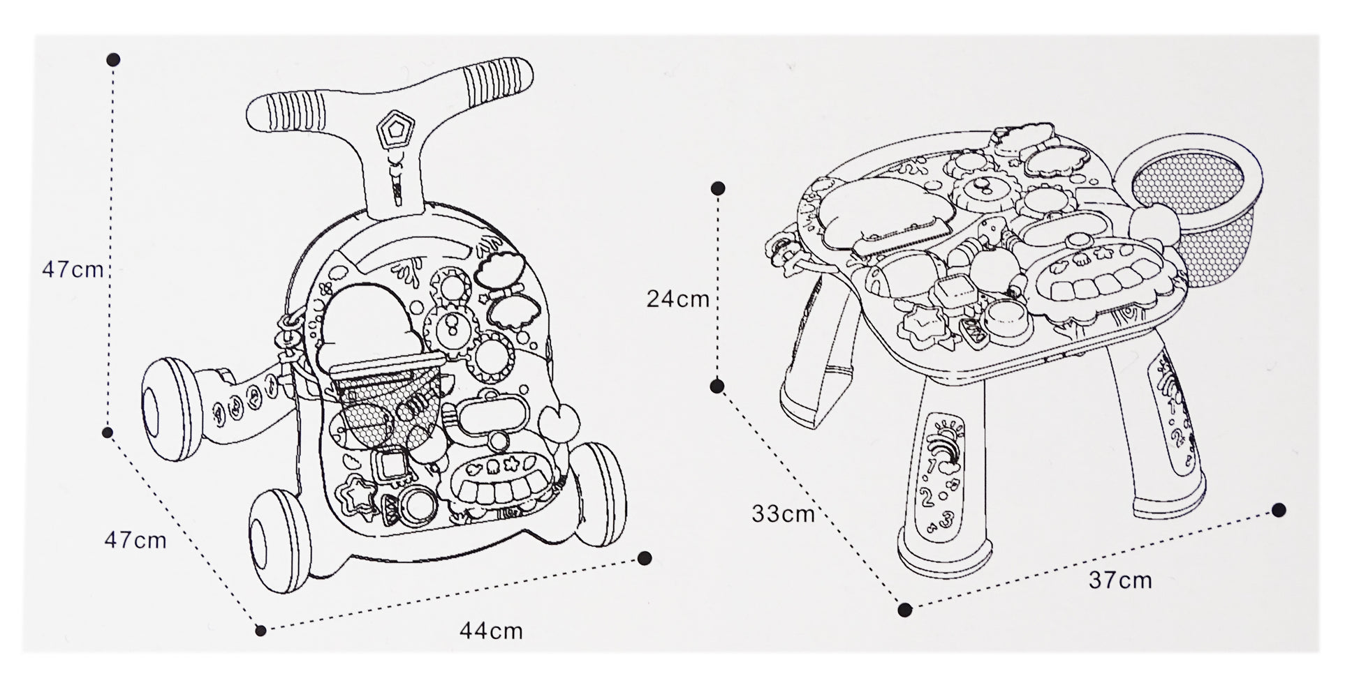 - Antemergatorul are jucarii detasabile cum ar fi: Pian Crab cu Sunete si Lumini, Forme Geometrice