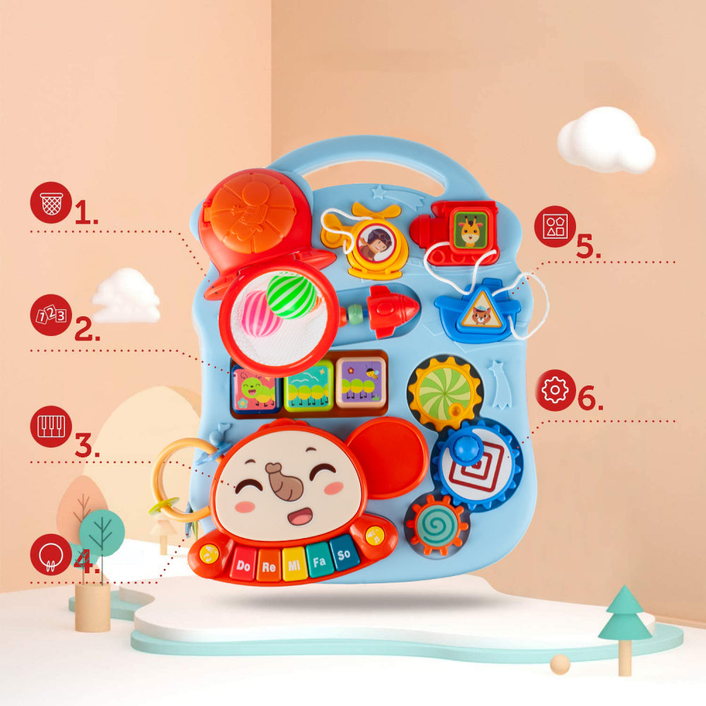 Panoul multifunctional poate fi scos de pe premergator, panoul este echipat cu curele care iti permit sa-l atasezi la patut. Copilul poate exercita pe deplin coordonarea mana-ochi a bebelusului si ii poate stimula curiozitatea.