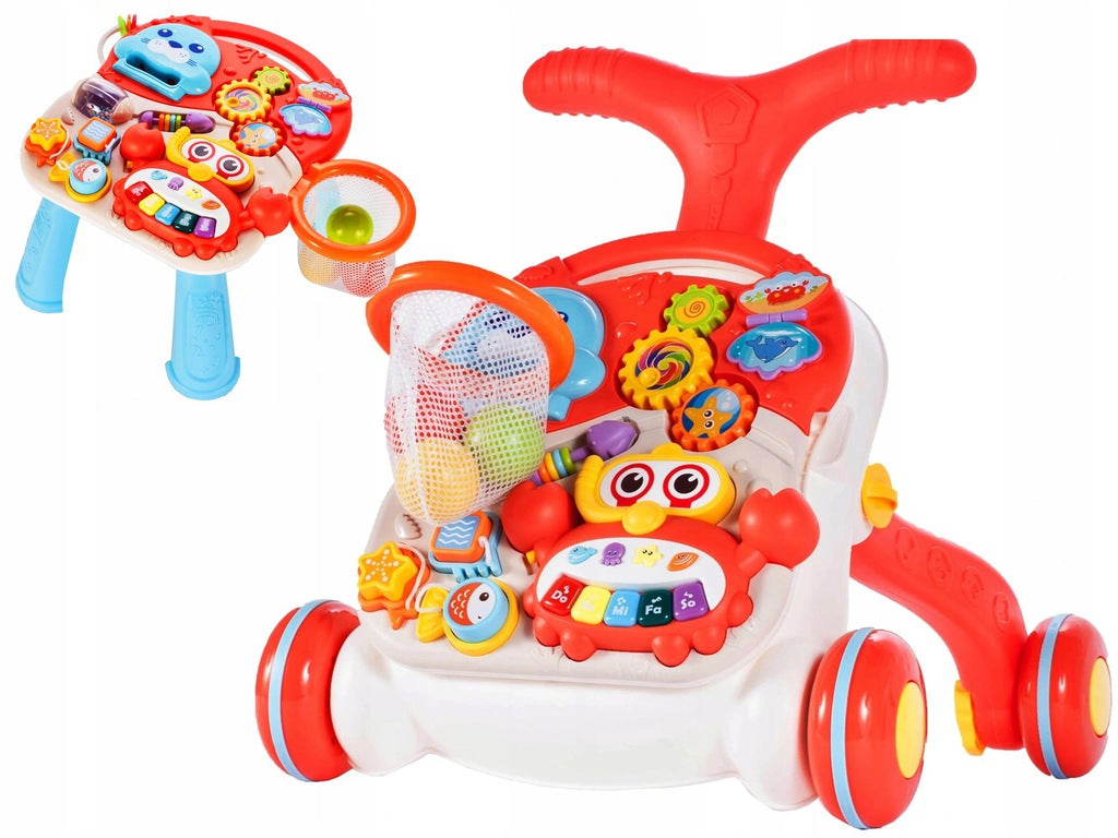 Aceasta produs este o jucarie 2 in 1. Se poate folosi ca si antepremergator sau o masuta cu activitati. Antepremergatorul ajuta bebelusul sa prinda incredere in propriile forte odata ce invata sa mearga si este recomandat de la varsta de 12 luni. Multiplele jucarii atasate, cum este si cosuletul de baschet tin copilul ocupat un timp indelungat. Ajuta copilul sa-si perfectioneze mersul, incurajand independenta. Imbunatateste balansul, coordonarea si abilitatile motorii in timp ce copilul invata sa impinga si mai apoi sa traga jucaria. Intareste abilitatile motorii prin activitatile desfasurate de copil in timp ce se joaca cu accesoriile jucariei. Rotile din spate se pot bloca si sunt acoperite cu o banda de silicon antiderapanta, ca antepremergatorul sa nu alunece si pentru a proteja pardoseala.
