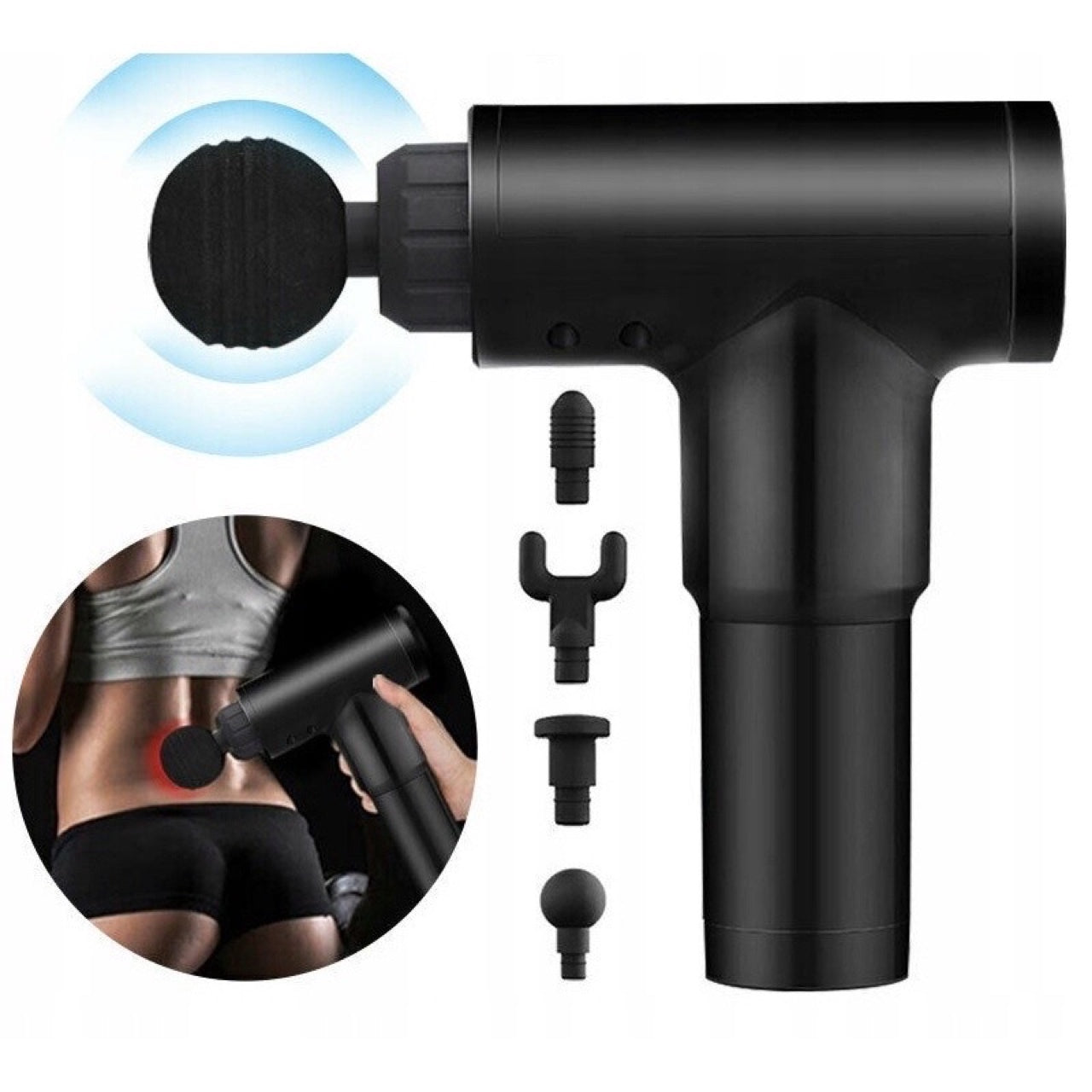 Pistolul de masaj vine cu 4 capete de masaj interschimbabile de diferite tipuri, astfel incat sa puteti schimba cu usurinta tipul de masaj si sa ajustati varful la nevoile dumneavoastra. Gasiti aici un tip dedicat special masajului vertebrelor, un varf profilat pentru articulatii si, in plus, un varf pentru toate partile corpului si un varf special pentru grupele mari de muschi.