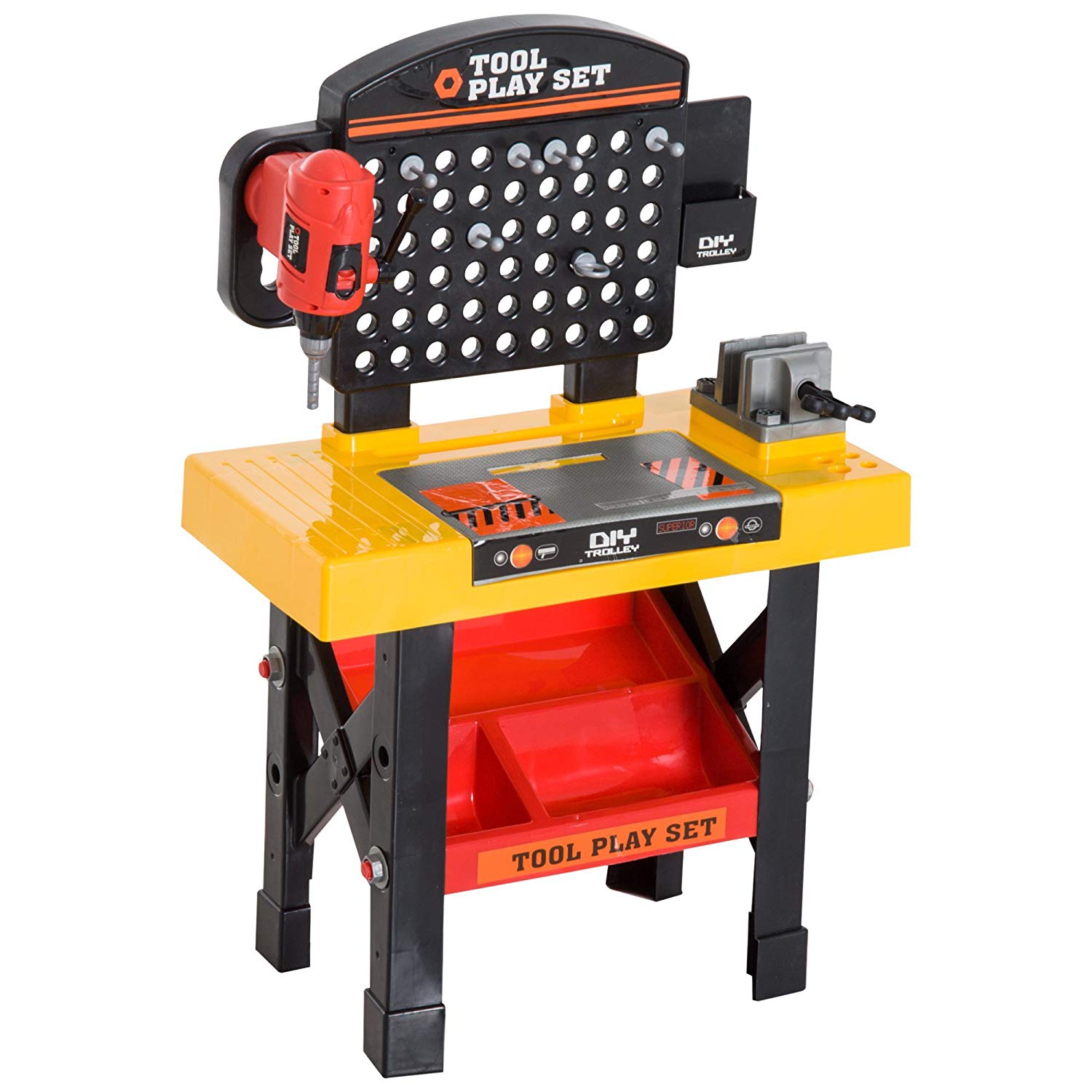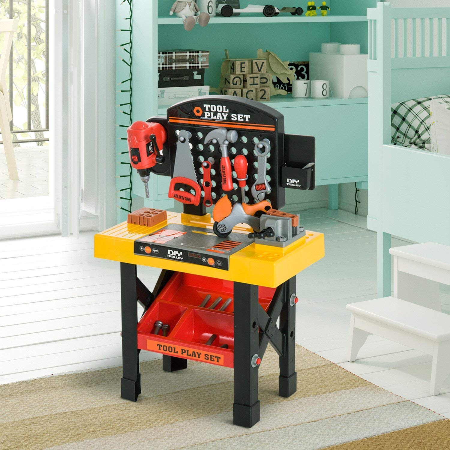 Bancul de lucru este echipat cu numeroase accesorii printre care o surubelnita fara fir, ciocan, cheie, surubelnita, fierastrau si multe alte scule.