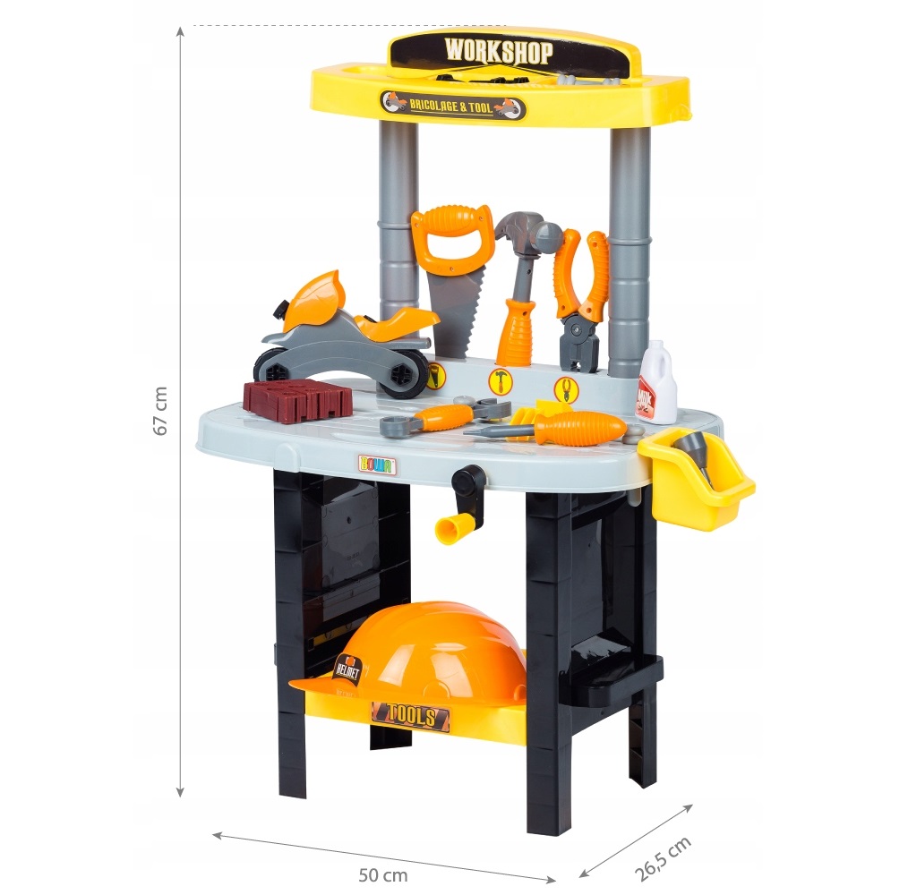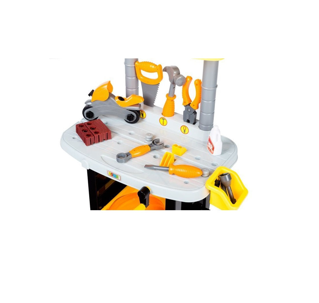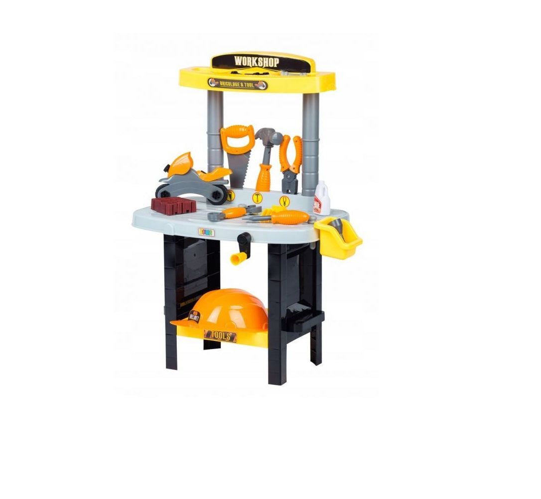 Banc de Lucru INTERACTIV IDL, THE FIRST WORKSHOP, Model cu 39 Accesorii cu Facilitati Interesante: casca protectei, ciocan, surubelnita, fierastrau, suruburi si piulite pentru a Dezvolta propriul atelier