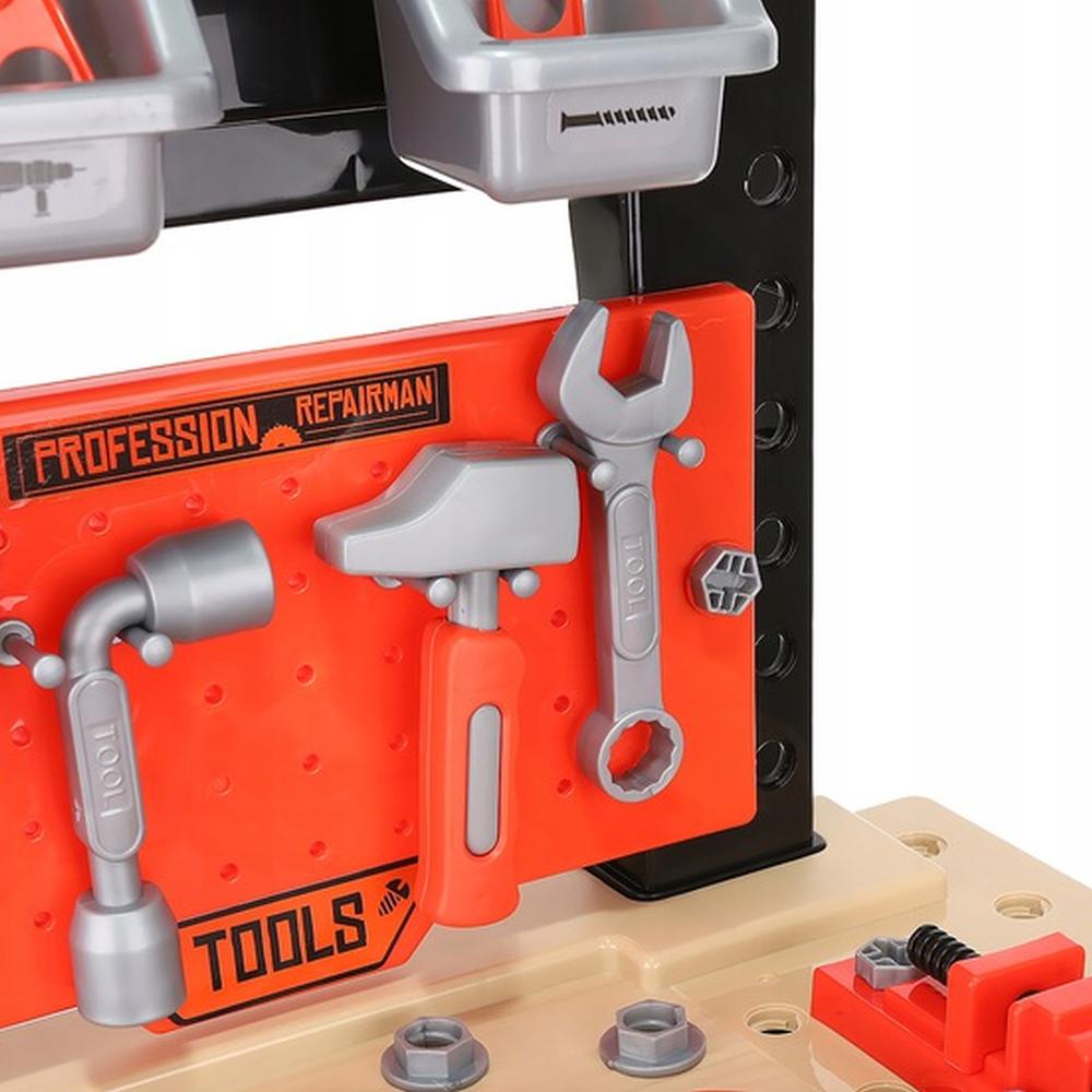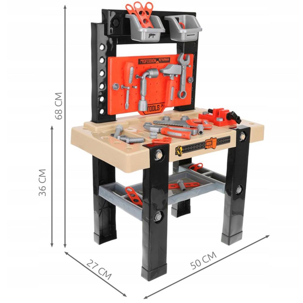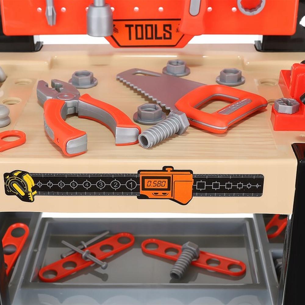 - Cu blat de lucru, raft inferior, panou pentru agatat scule, 2 cutii de depozitare si multe scule si unelte cu design realistic