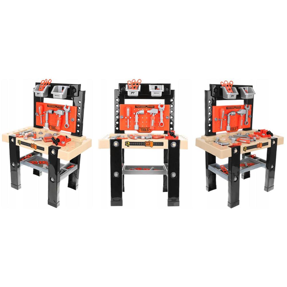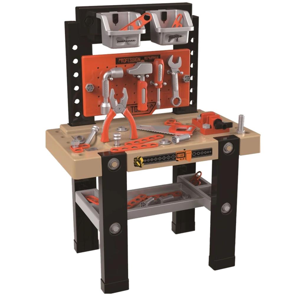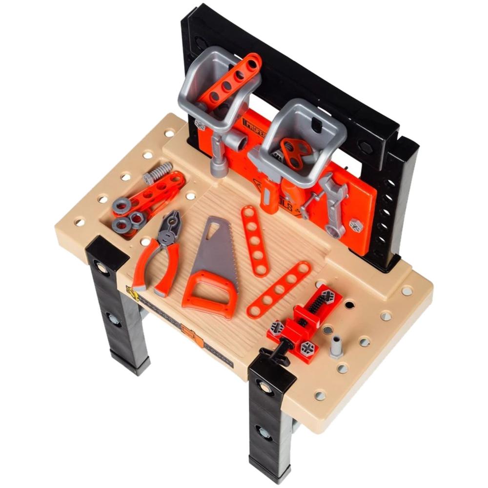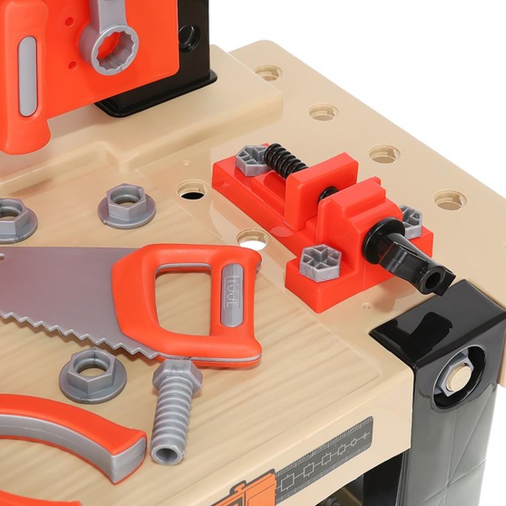 - Cu blat de lucru, raft inferior, panou pentru agatat scule, 2 cutii de depozitare si multe scule si unelte cu design realistic