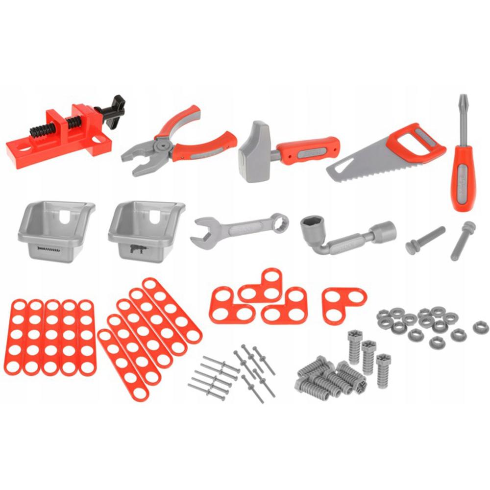 Elementele setului de joc sunt absolut sigure pentru copil, deoarece sunt confectionate din plastic rezistent si netoxic. Setul are elemente care imita diverse materiale precum lemnul sau otelul, care in combinatie cu imaginatia nelimitata a copiilor stimuleaza creativitatea. Jocul il invata pe copil gandirea tehnica si logica. O idee de cadou perfecta nu numai pentru un tanar pasionat de bricolaj, ci si pentru acei copii care nu au avut inca ocazia sa descopere cata bucurie si satisfactie ofera jocul cu suruburile, piulitele, precum si cheile si alte echipamente utilizate pentru reparatii si renovari. Sculele din plastic imita foarte realistic uneltele reale. Printre cele 65 de piese incluse in pachet se regasesc ciocan, patent, surubelnita, cheie fixa, tubulare, fierastrau de mana, menghina, suruburi, piulite, cuie, nituri si multe altele.