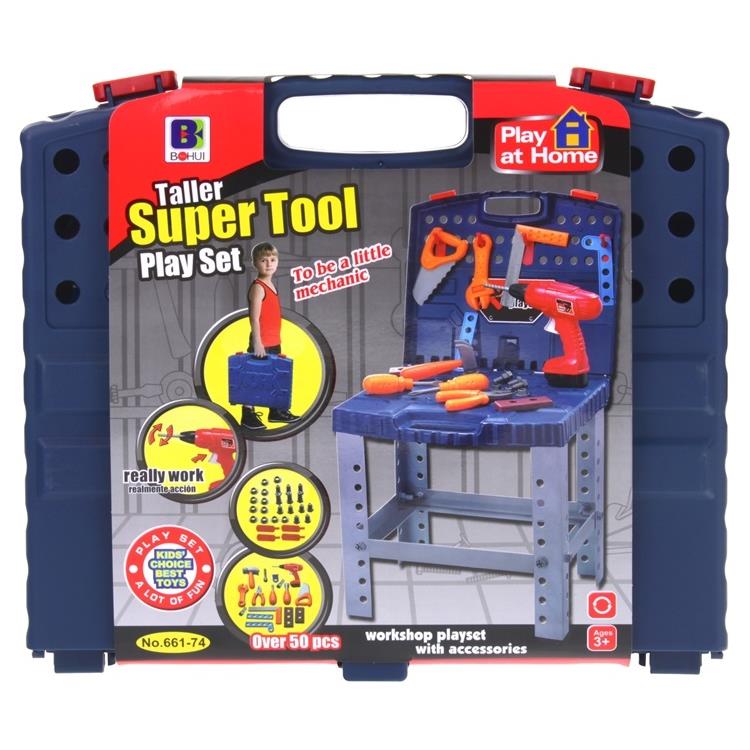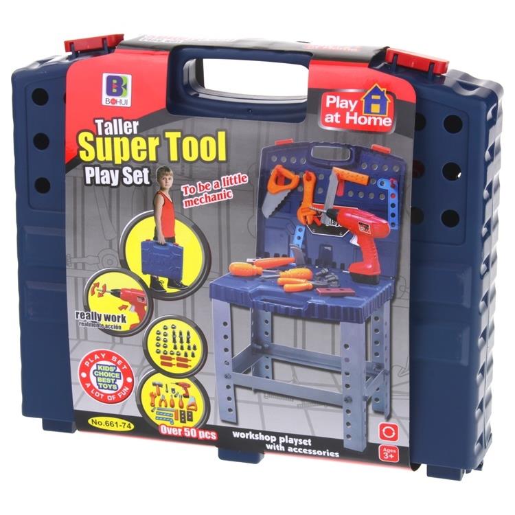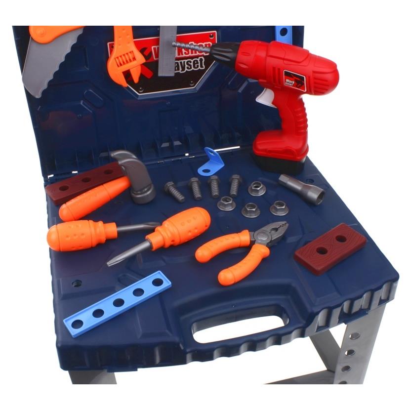 Banc de Lucru, Super Tools, Asamblat in Valiza Practica si Usor de Carat, 50 Accesorii +, Include Bormasina Functionala, Surubelnite, Ciocan, Fierastrau, 72 cm Inaltime, Albastru