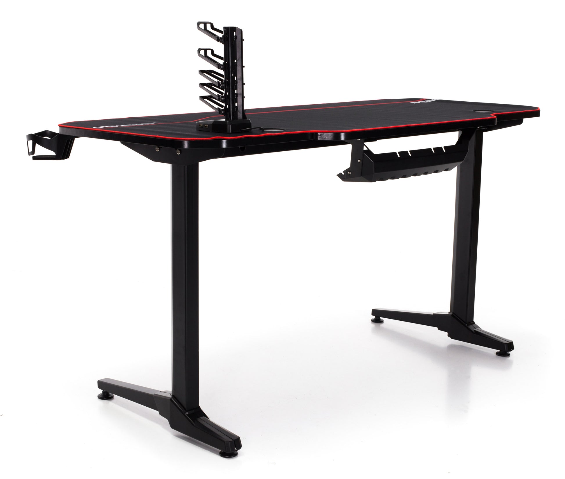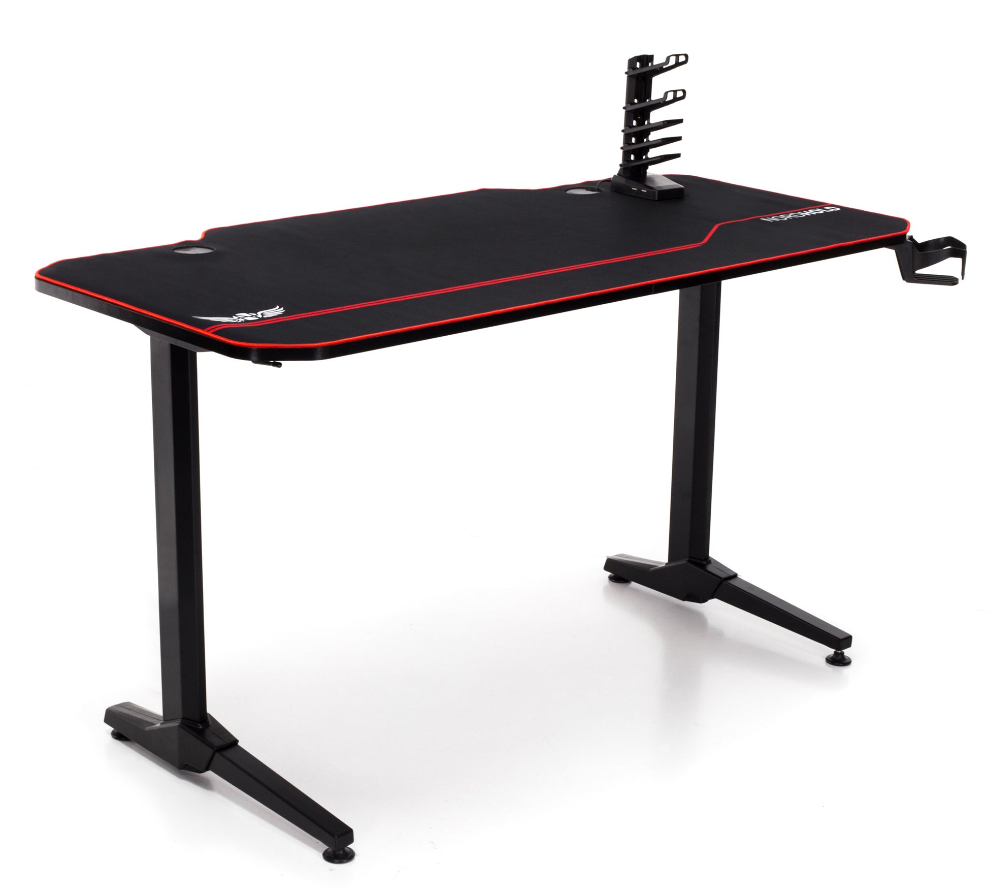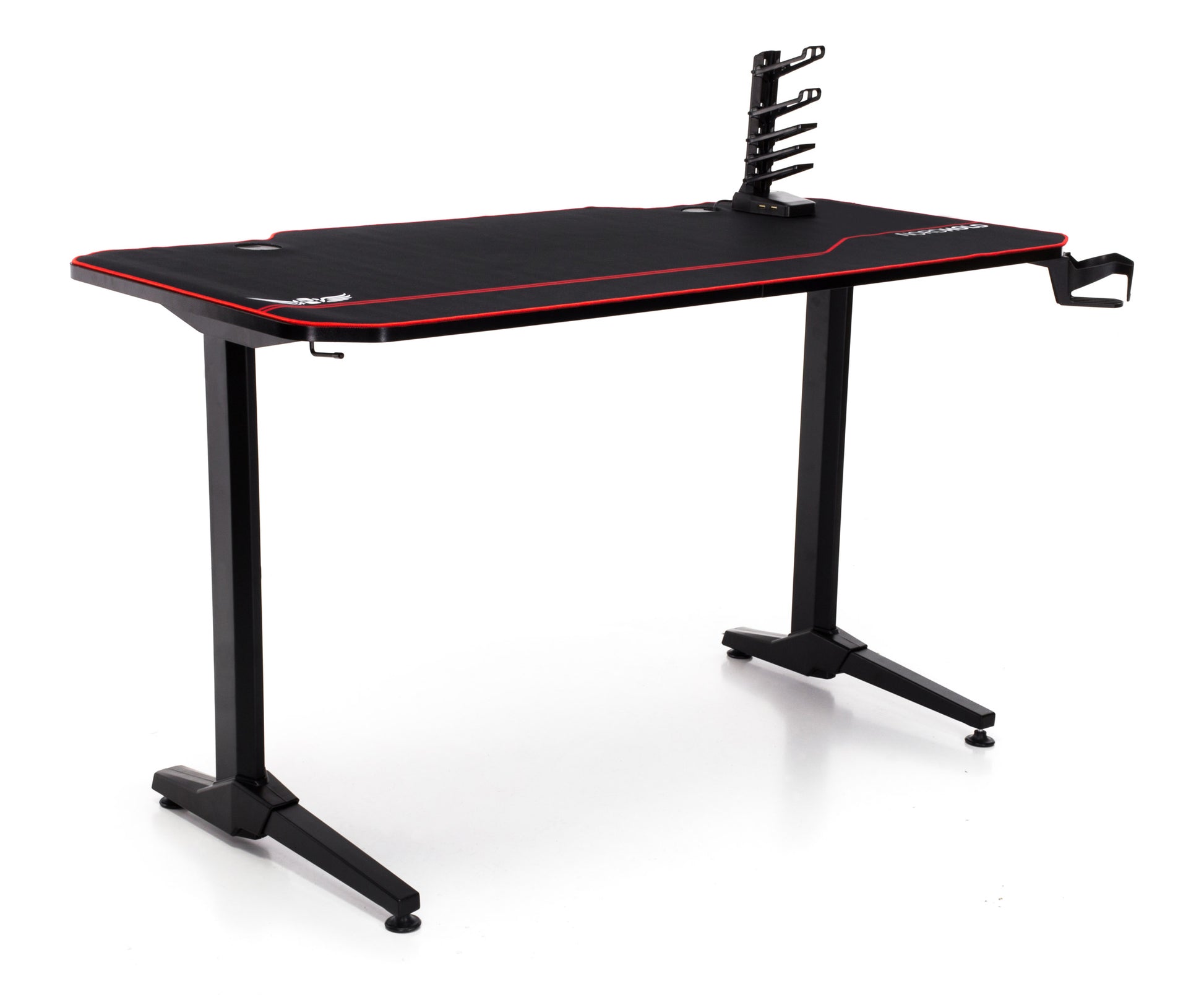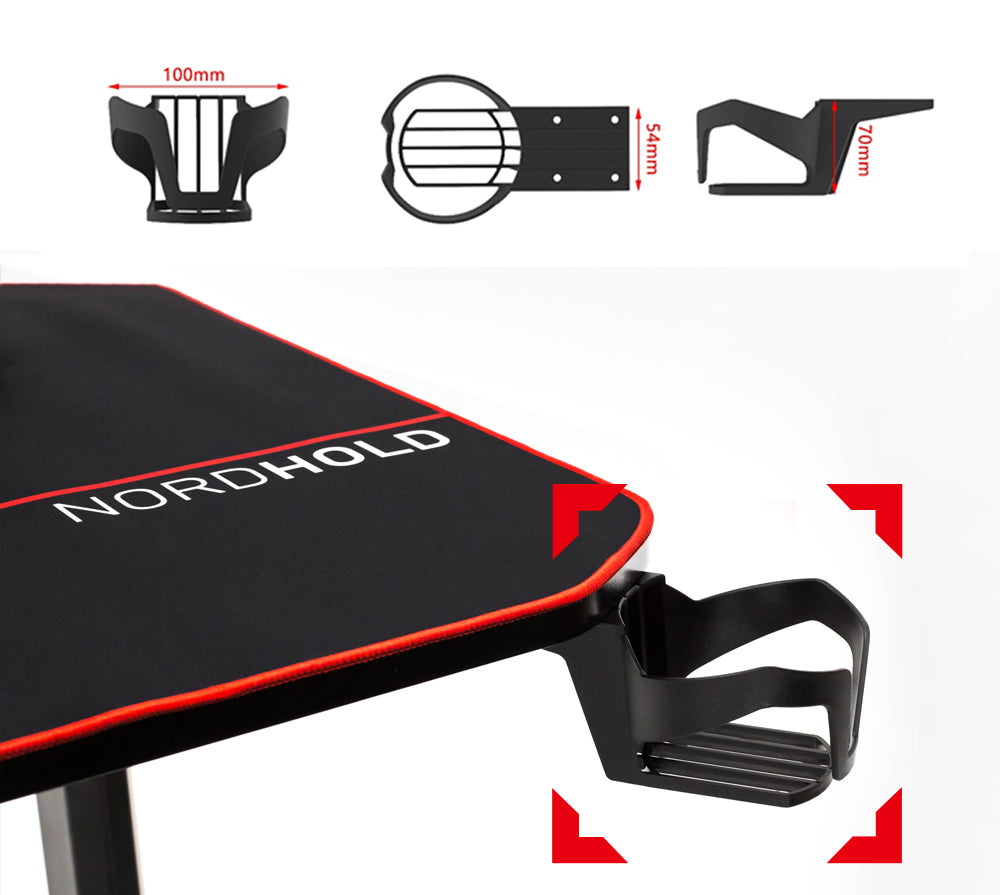 Birou Gaming cu suprafata tip mousepad idealSTORE Shark GD HOLD, Dimensiuni 140 x 66 x 77 cm, Prevazut cu picioare stabile, Accesorizat cu suport pentru casti, pahar si mousepad, Echipat cu orificii speciale pentru cabluri, Negru-Rosu