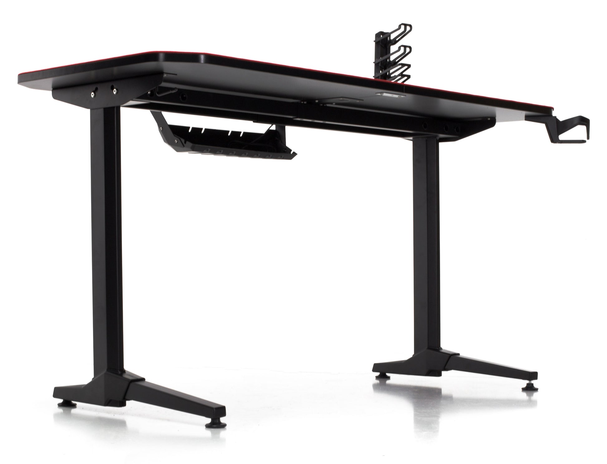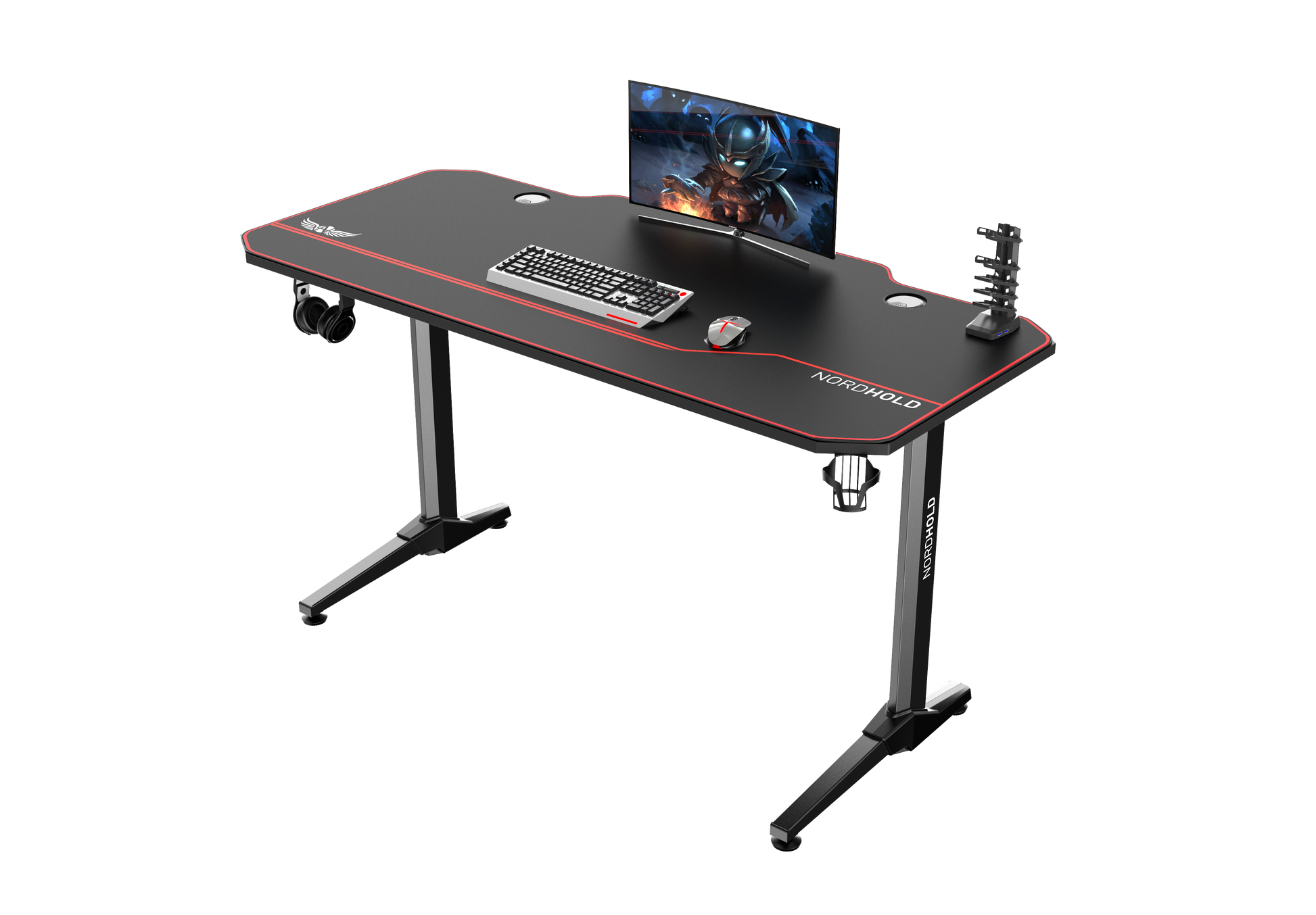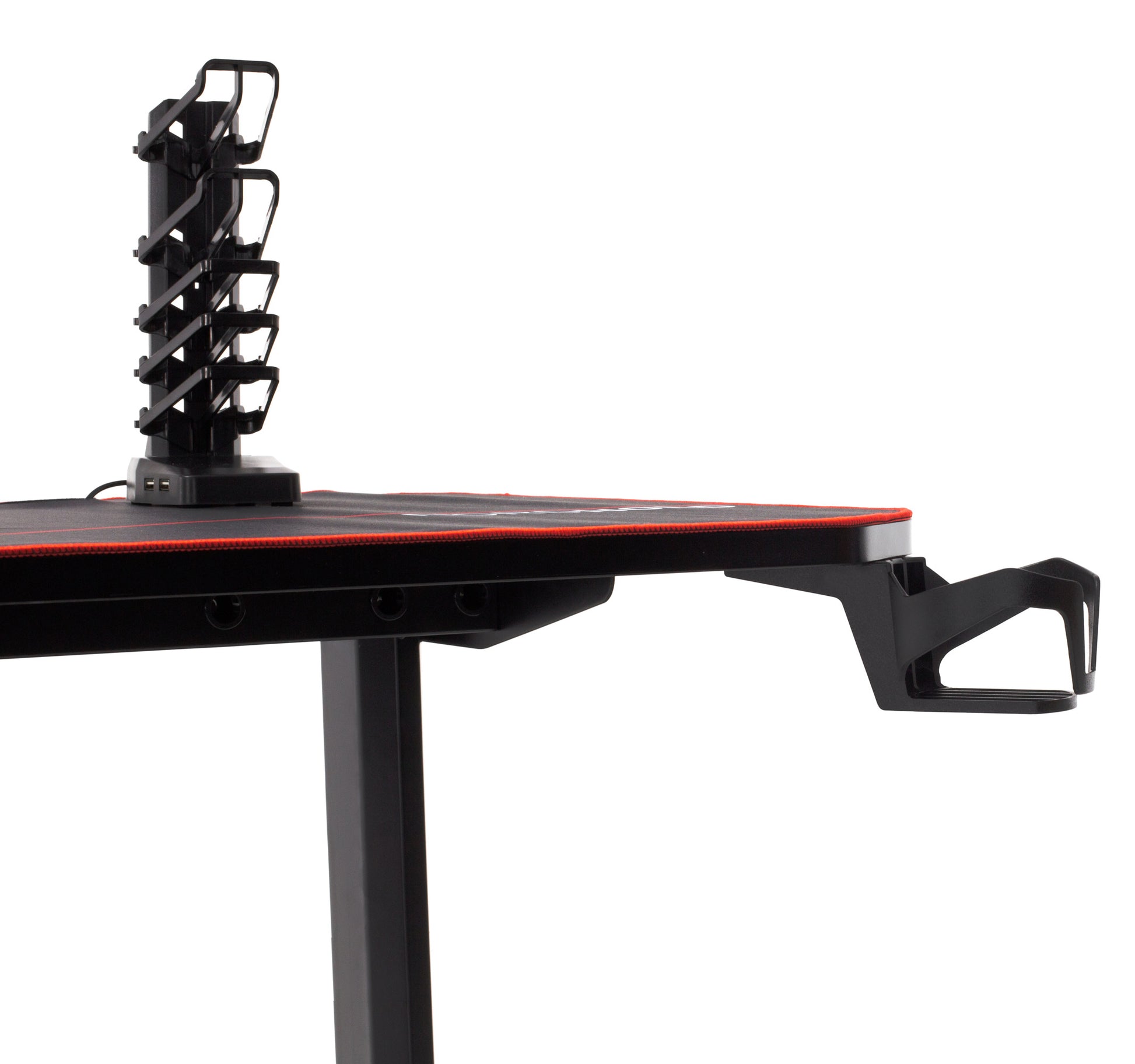 Birou Gaming cu suprafata tip mousepad idealSTORE Shark GD HOLD, Dimensiuni 140 x 66 x 77 cm, Prevazut cu picioare stabile, Accesorizat cu suport pentru casti, pahar si mousepad, Echipat cu orificii speciale pentru cabluri, Negru-Rosu