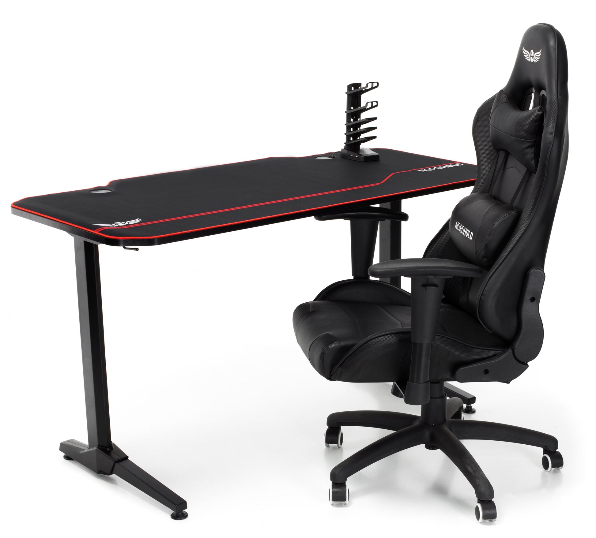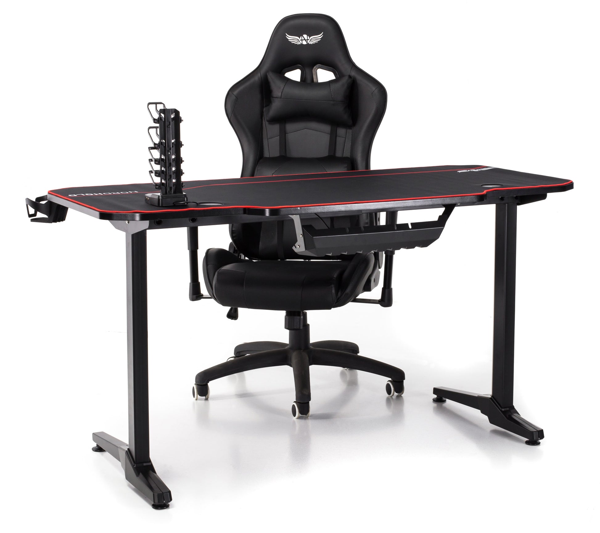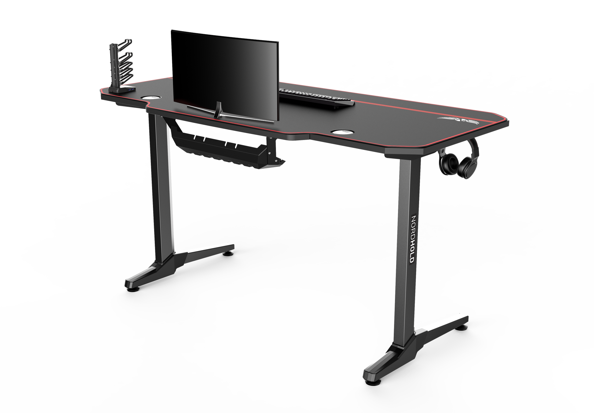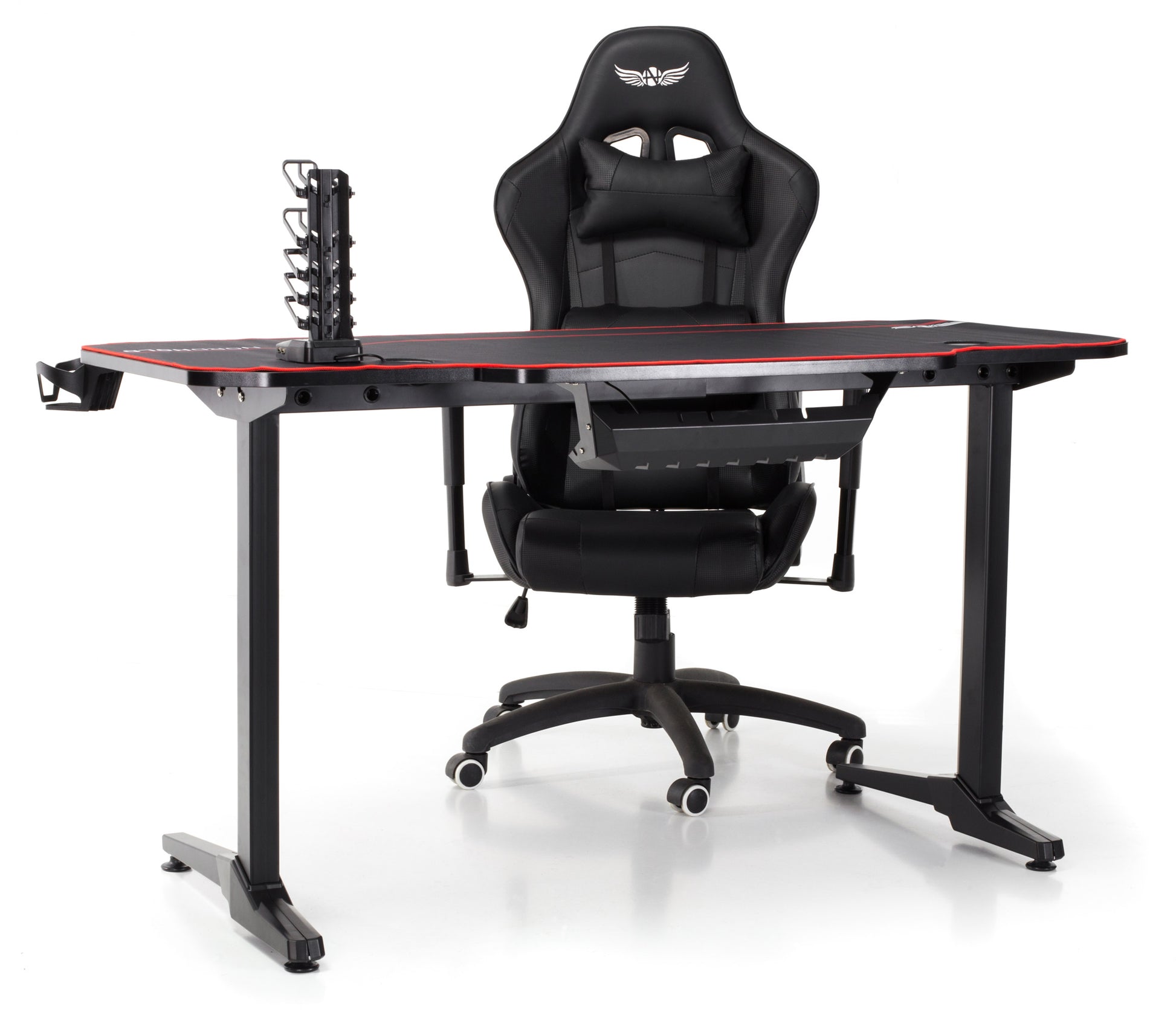 Birou Gaming cu suprafata tip mousepad idealSTORE Shark GD HOLD, Dimensiuni 140 x 66 x 77 cm, Prevazut cu picioare stabile, Accesorizat cu suport pentru casti, pahar si mousepad, Echipat cu orificii speciale pentru cabluri, Negru-Rosu