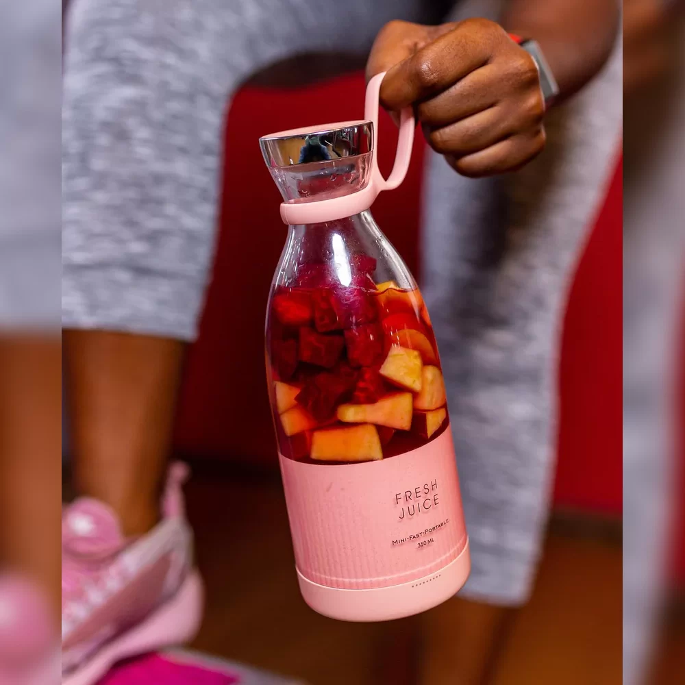 Blender Portabil pentru Bauturi, FreshJuice Smart, Incarcare Wireless, 4 Lame, Capacitate 350ml, Multifunctional, Roz