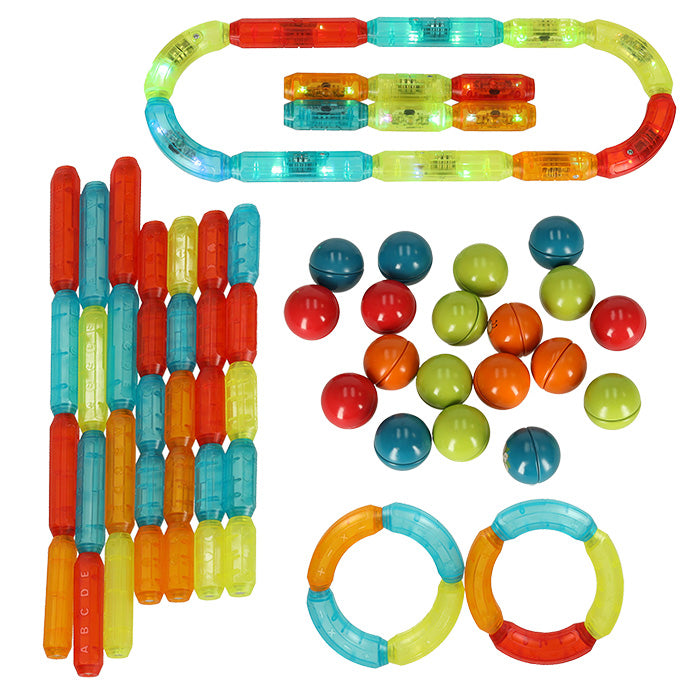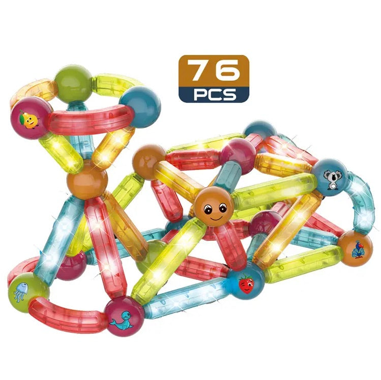 Blocuri Magnetice idealStore StiksMag, 76 Elemente, cu Lumini, Se pot crea Multiple Figuri si Cladiri, Piese de dimensiuni Mari, Dezvolta Abilitatile Manuale, Abilitati Motorii Fine, Imaginatia Spatiala