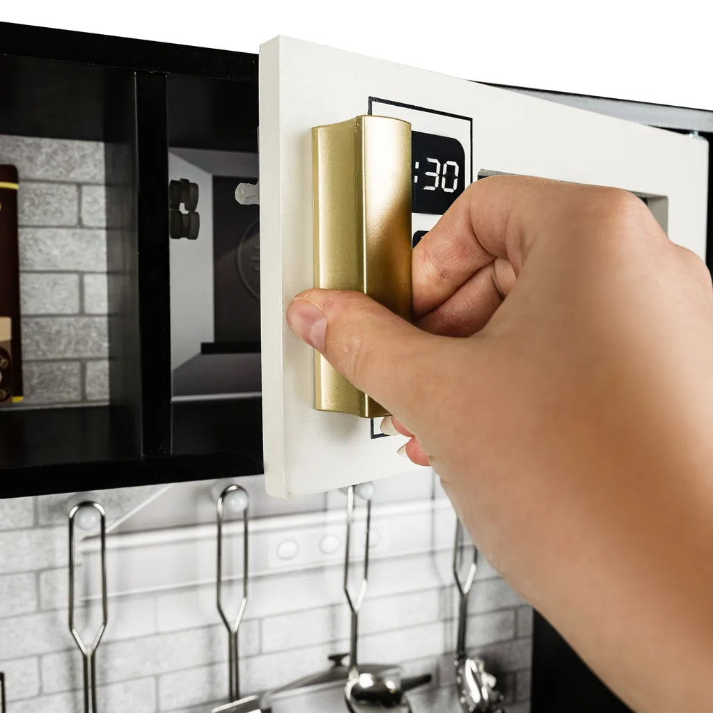 Bucatarie de lemn Kitchen Master, Echipata cu frigider, Telefon, Cuptor cu microunde, Chiuveta, Masina de spalat, Material de inalta calitate, Dotata cu o lampa functionala si cu o multitudine de ustensile, Negru