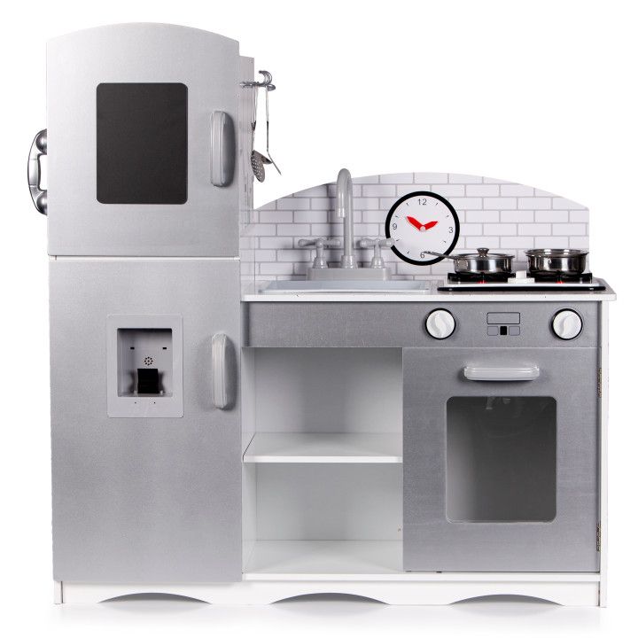 Frigiderul contine dozator de apa. Butoanele cuptorului fac clic, usile se deschid, iar vasele si lingurile vor oferi o multime de distractie.