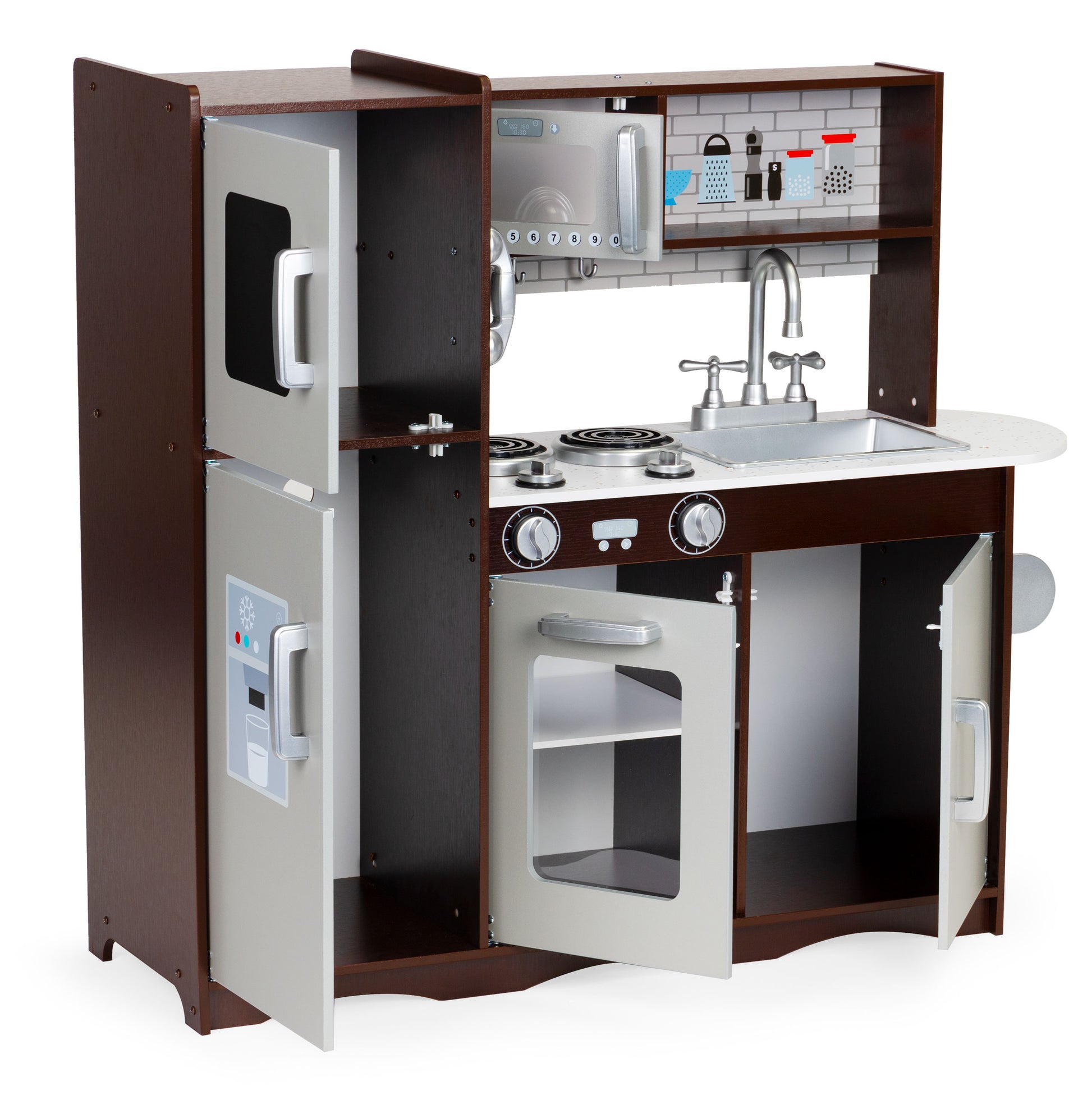 Bucatarie Profesionala din Lemn Pentru Copii Luxury Kitchen idealSTORE, Include Cuptor Frigider Dulap, Aragaz echipat cu butoane Ustensile de bucatarie, Structura solida, Microunde, Perfect pentru un mic bucatar