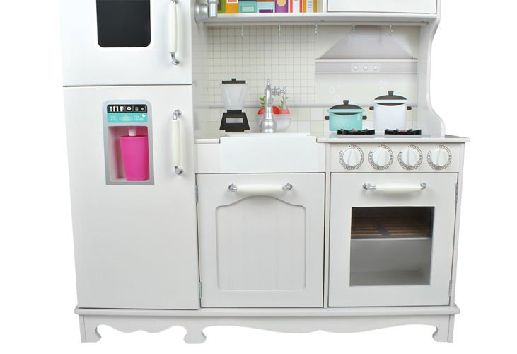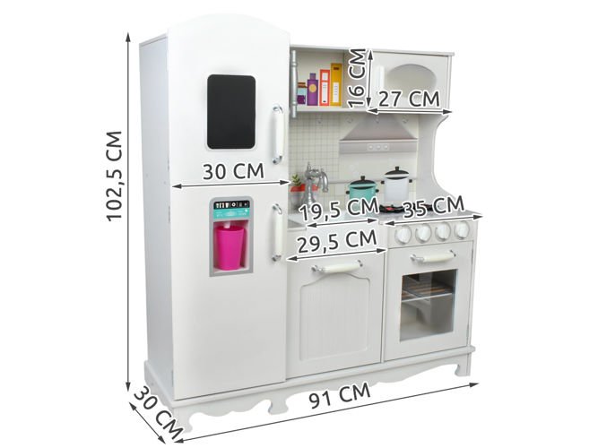 Copiii sunt in mod natural curiosi de mediul inconjurator si le place sa-i imite pe altii. Bucataria din lemn este o modalitate fantastica pentru copiii mici, carora le place sa se joace si sa pregateasca mesele. Bucataria permite jocul de rol, de la o varsta frageda, si are o functie educationala. Produsul este o idee grozava pentru a evita plictiseala, mai ales cand vremea de afara este ploioasa. Jucaria are elemente mobile, cum ar fi usi si butoane, care o fac si mai realista. Bucataria este prevazuta cu o chiuveta detasabila, care permite umplerea cu apa, pentru a spala vasele. Realizata cu mare atentie la detalii, aceasta bucatarie va fi cu siguranta o surpriza placuta pentru orice copil.