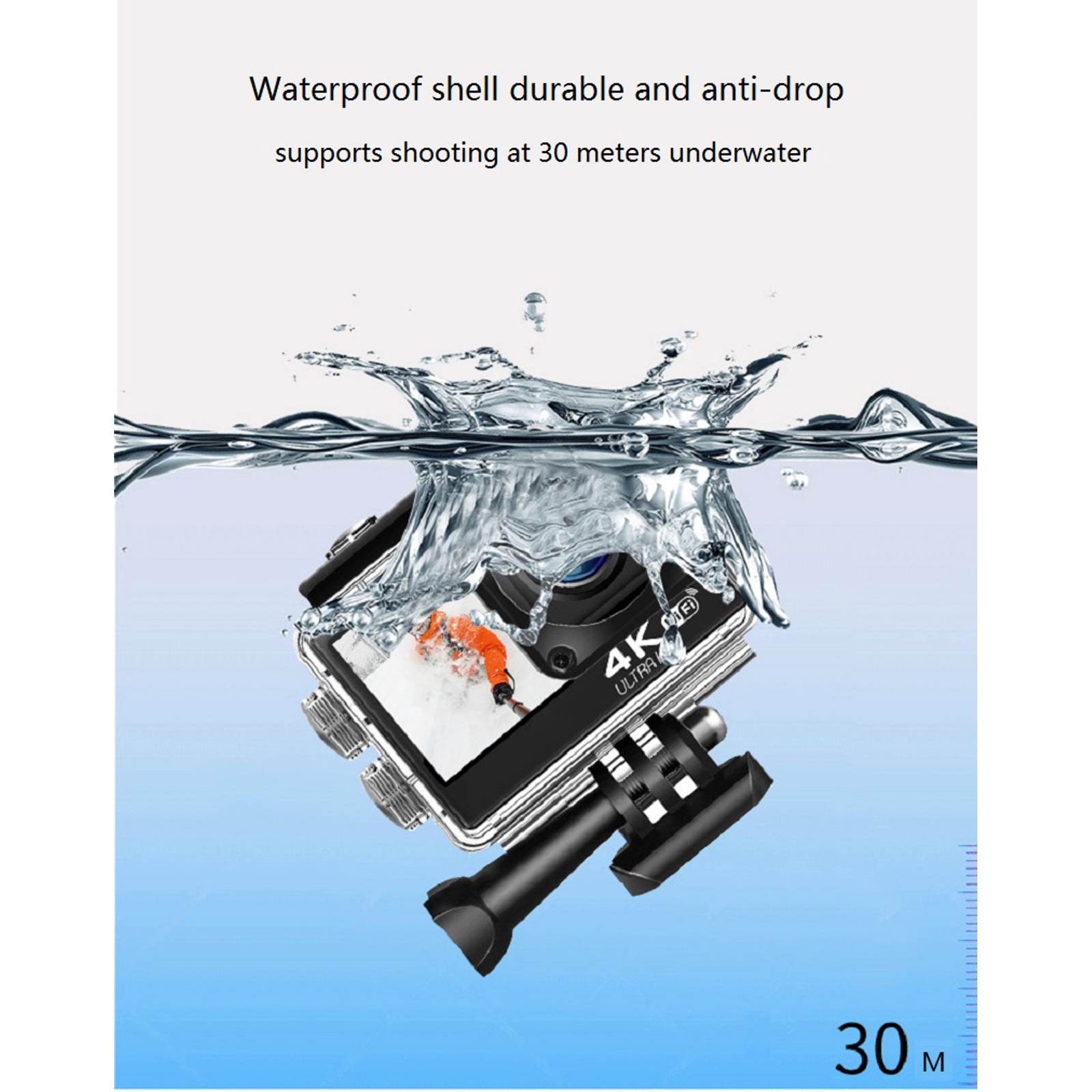 Aceasta camera subacvatica vine, de asemenea, cu carcasa rezistenta la apa, se poate scufunda adanc pana la 30 m pentru aventura.