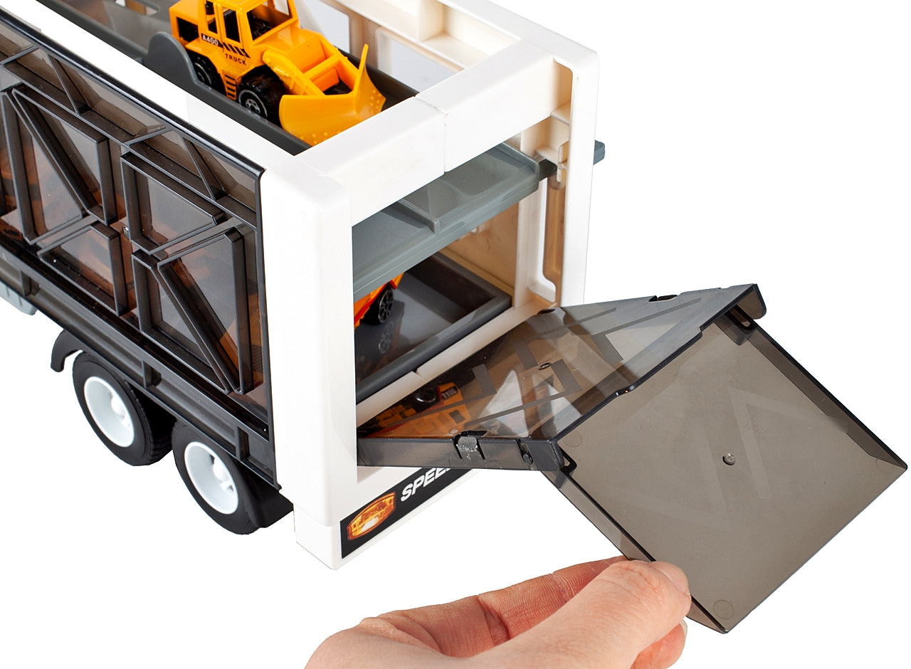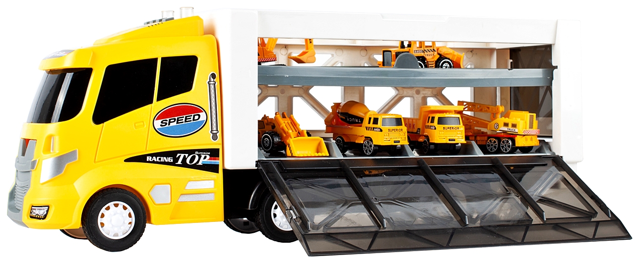 Camion cu Vehicule de constuctii Speed Top Racing idealSTORE, Dimensiuni 43 x 12 x 17 cm Echipat cu roti durabile din cauciuc, Efecte sonore, Lumini, Rampa, Accesorizat cu 6 vehicule, Fabricat din plastic durabil