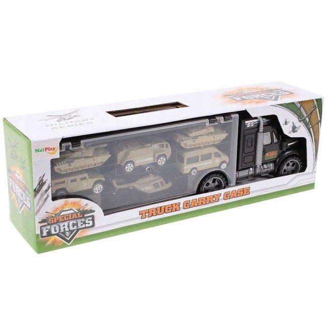 Camion interactiv cu vehicule militare idealSTORE Heavy Duty Army Transport, Echipat cu 6 vehicule militare, Maner pentru a facilita transportul camionului, Vehicule cu piese mobile