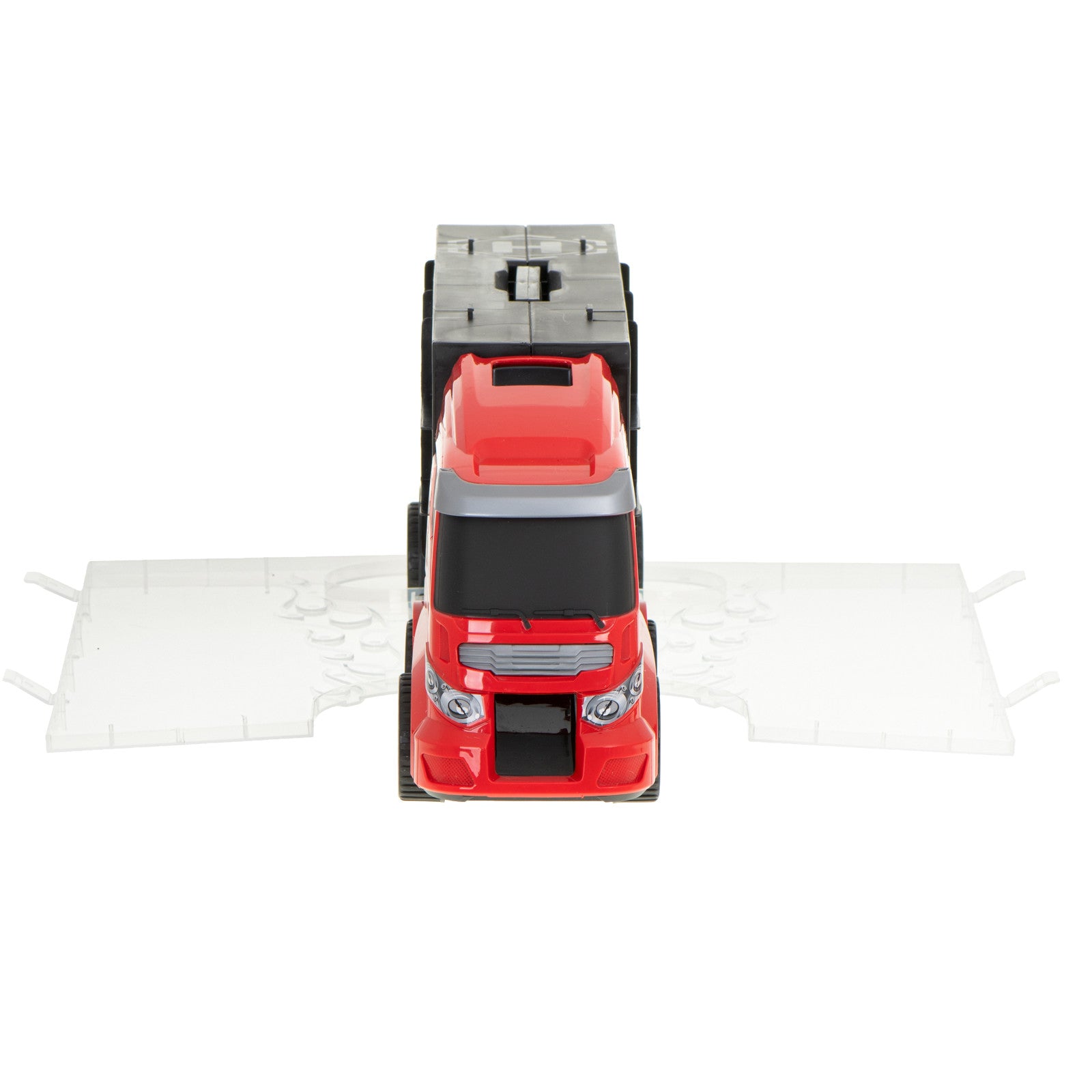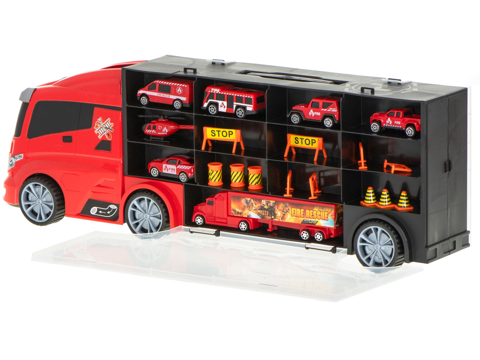 Camion Transportator Fire Rescue idealSTORE, Dimensiuni 57 x 11 x 20 cm, Include 7 Vehicule din Plasctic, Semne de Circulatie, Capacitate pana la 26 de Masini, Lansator de Masini, Maner pentru Transport