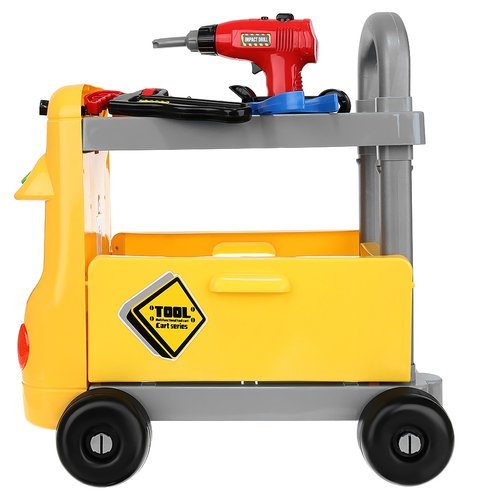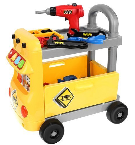 - ATELIER DE JUCARII PENTRU COPII 2 in 1 - acest carucior mare, functional, pe roti, este o jucarie interesanta si educativa pentru cei mai mici pasionati de bricolaj. Are doua functii: poate fi un atelier si un simplu carucior in care copilul isi va cara jucariile. Setul include: ciocan, burghiu cu acumulator, fierastrau, cheie, cleste, cheie combinata, suruburi, lamele si organizator. Partea inferioara a caruciorului are parti laterale pliate, datorita carora poate fi folosit ca o cutie de depozitare a sculelor.