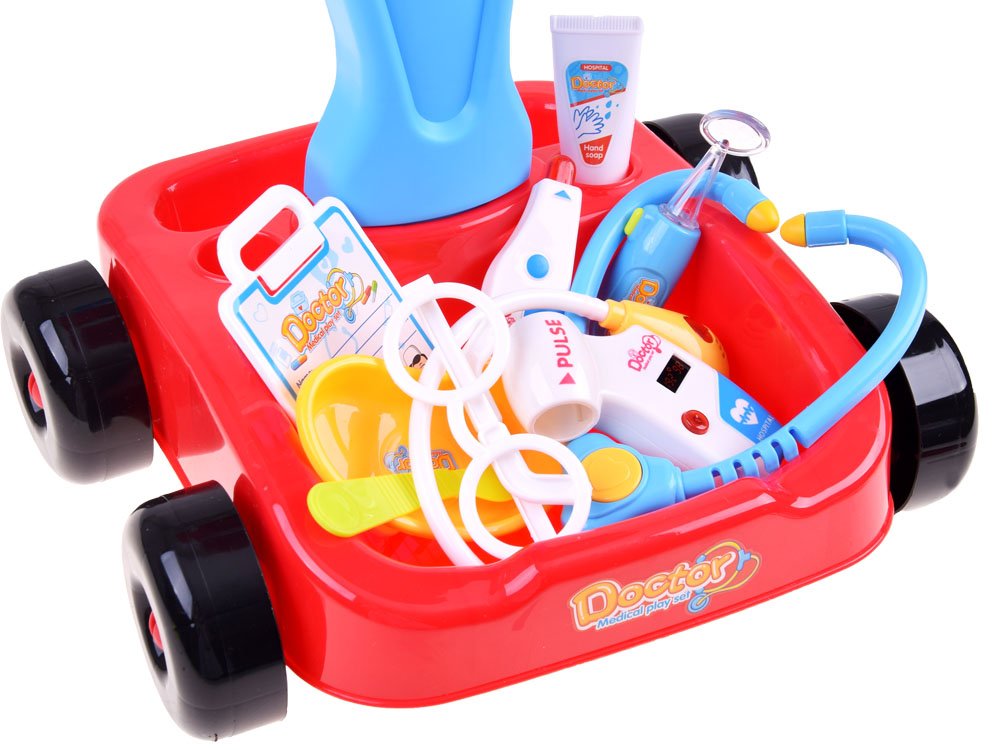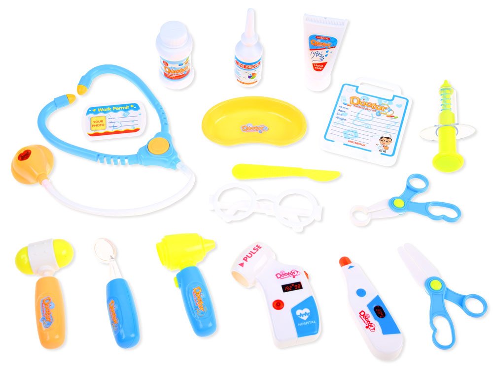 Un set senzational, bine echipat pentru orice copil care isi doreste sa fie medic. In cutie, copilul va gasi si un ciocan de reflex, un stetoscop, un examinator de urechi, ochelari si o seringa. Puteti introduce propriul nume si numar de serie pe eticheta cu numele din set. Efecte de sunet si lumina (dispozitiv EKG, stetoscop, oglinda dentara, otoscop ORL, termometru). Panoul ECG este alimentat de baterii, emite un sunet de batai ale inimii si indica starea pacientului (sunet de alarma).