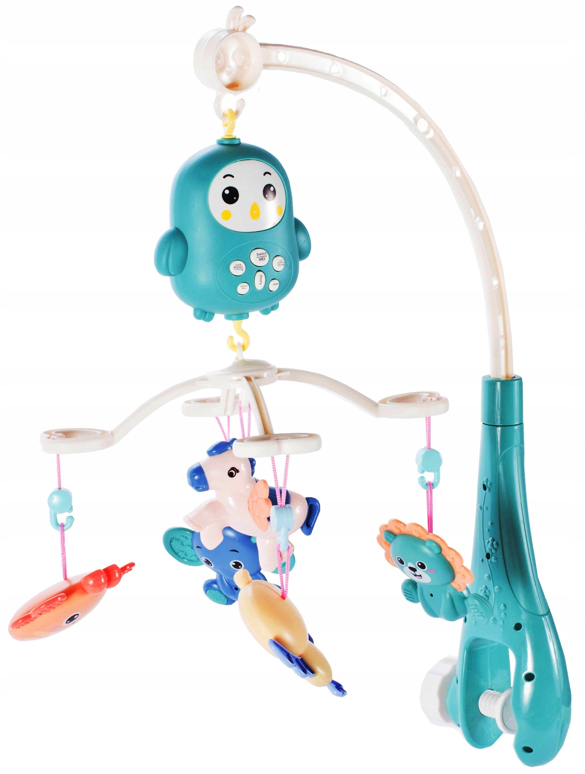 Carusel Interactiv Multifunctional Happy Bed Bell idealStore, Rotire 360°, Efecte Luminoase si Sonore, Cantece de Leagan, Povesti cu Animale, Zornaituri Detasabile, Telecomanda Inclusa