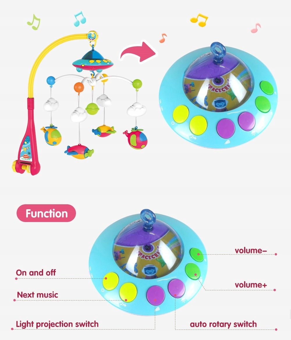 Caruselul multifunctional, colorat pentru copii este ideea perfecta pentru copii din prima zi a vietii. Jucariile rotative va incurajeaza sa va distrati in timpul zilei si setati 108 melodii si cantece pasnice care vor linisti si vor pregati bebelusul pentru somn. Datorita formelor multicolore si variate, copiii dezvolta imaginatia, simtul auzului si al vederii.