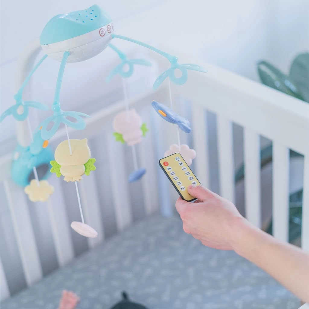 Usor de montat la patutul celui mic, acest model de carusel are avantajul ca poate fi controlat din telecomanda.