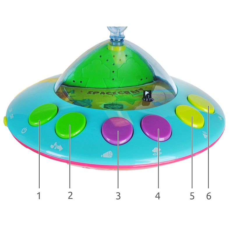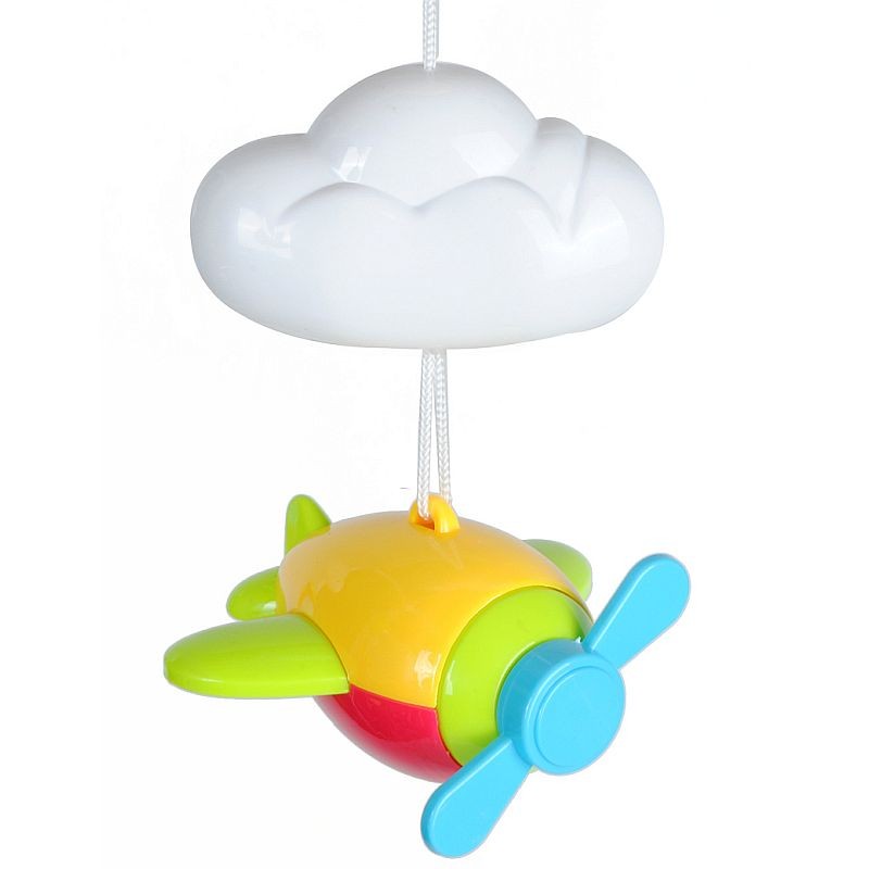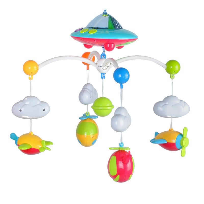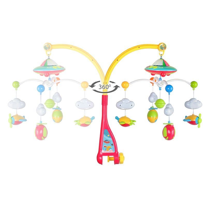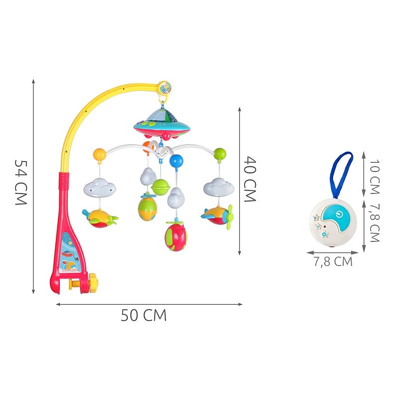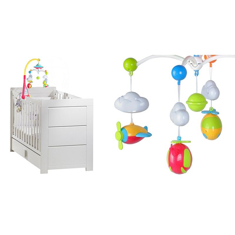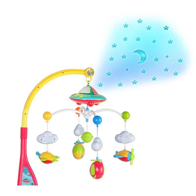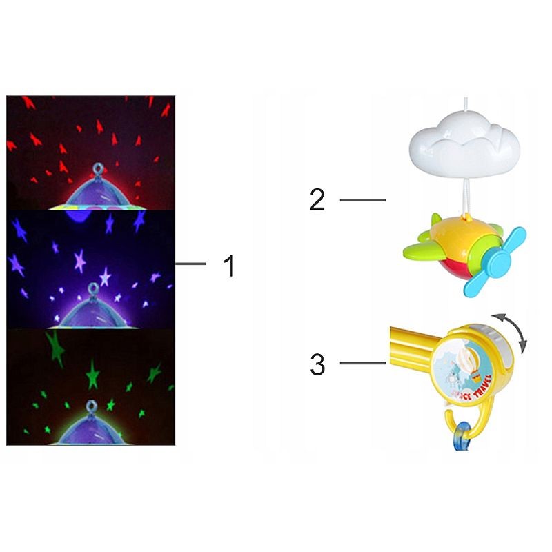 Pe langa ansamblul format din cele 4 jucarii colorate (nor si elicopter) si o jucarie zornaitoare, care se pot detasa cu usurinta si care au o rotatie de 180 grade, caruselul dispune in partea superioara si de un proiector a carui lumina poate fi schimbata (verde si albastru) precum si intensitatea acesteia. Acesta proiecteaza pe tavan stele si luna colorate, perfecte pentru a crea in intreaga camera o atmosfera linistitoare si placuta. Pentru un plus de atractivitate, caruselul are incluse si melodii linistitoare care au rolul de a calma copilul, iar volumul acestora poate fi controlat.