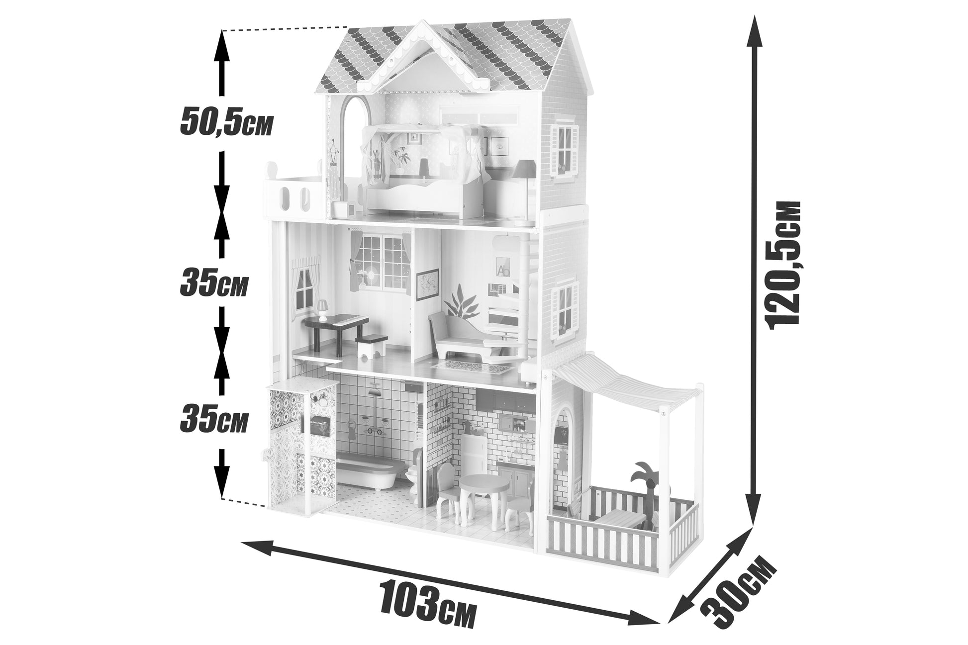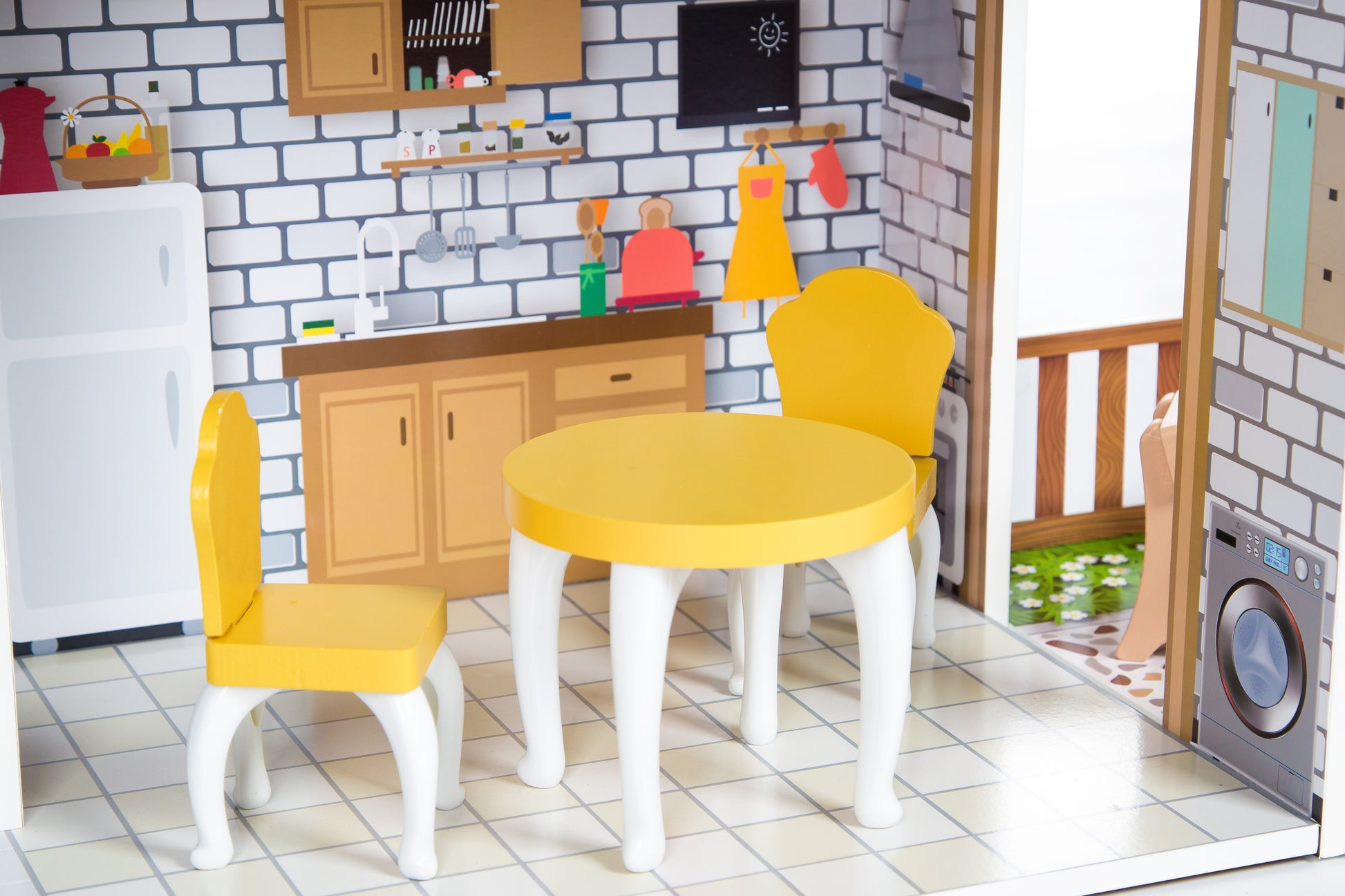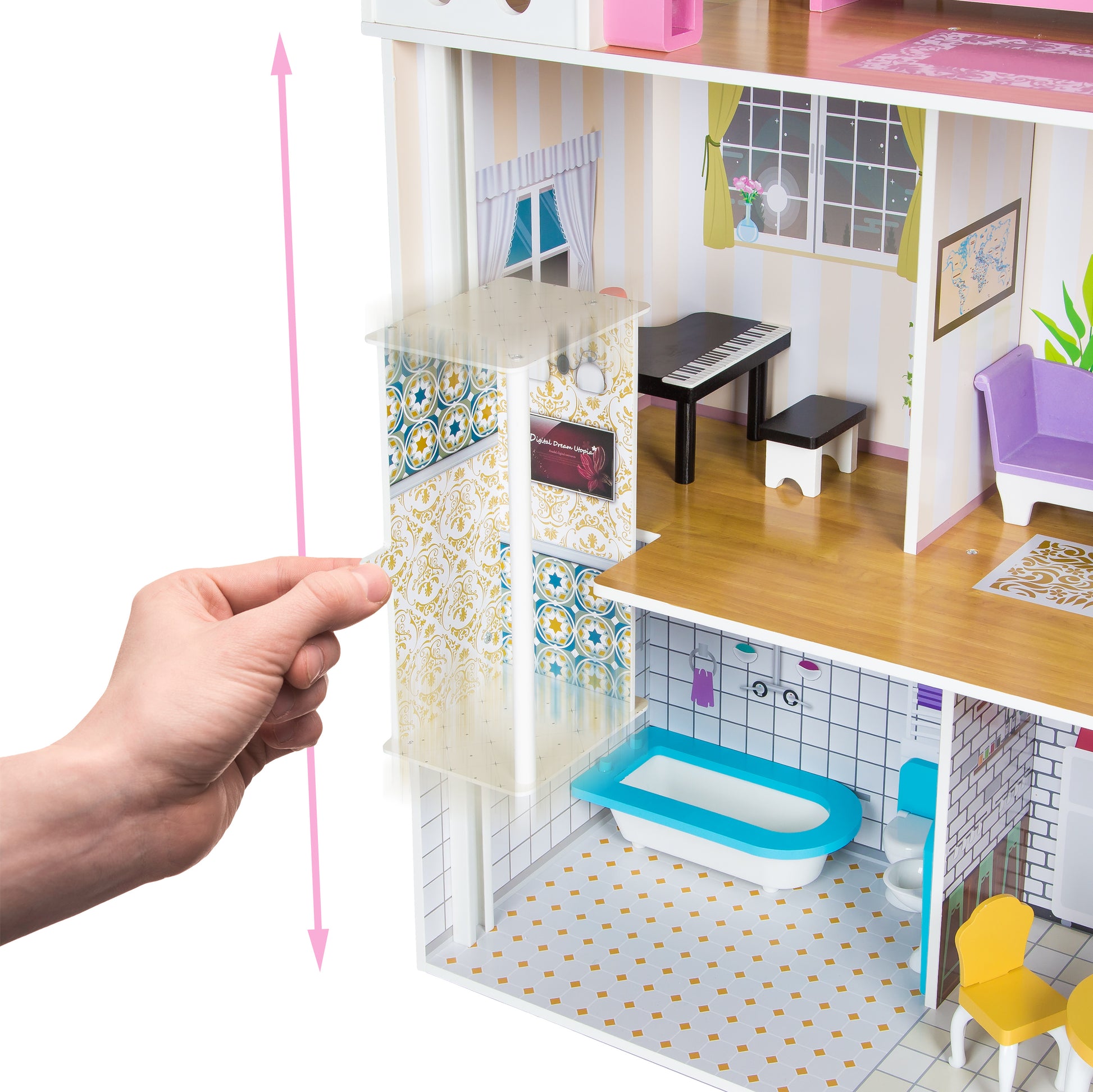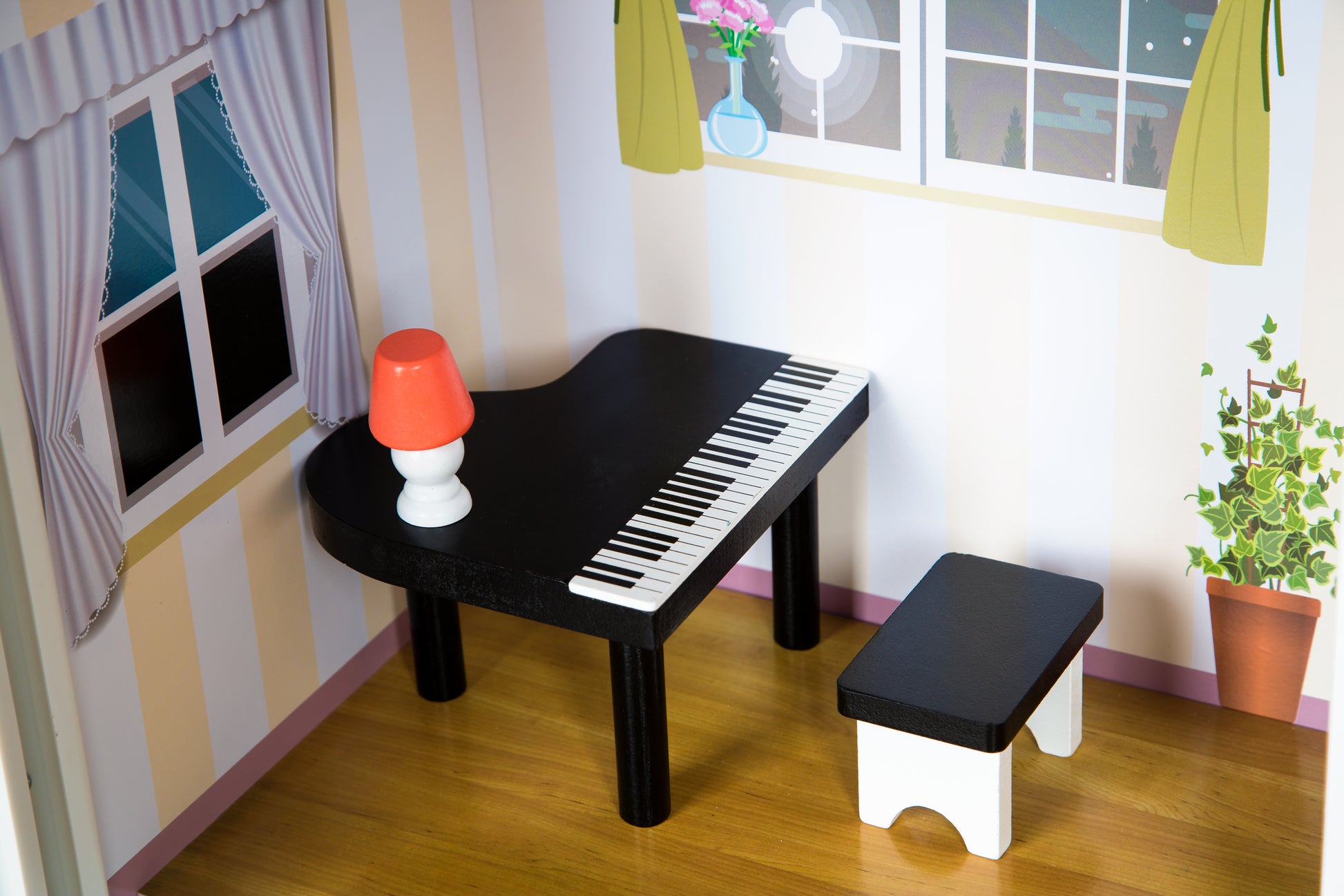 Casuta minunata cu trei nivele pentru papusi realizata din lemn este complet echipata, are incaperi mari si spatioase, in care continuu se poate de reorganizat mobilierul frumos din lemn si accesoriile.