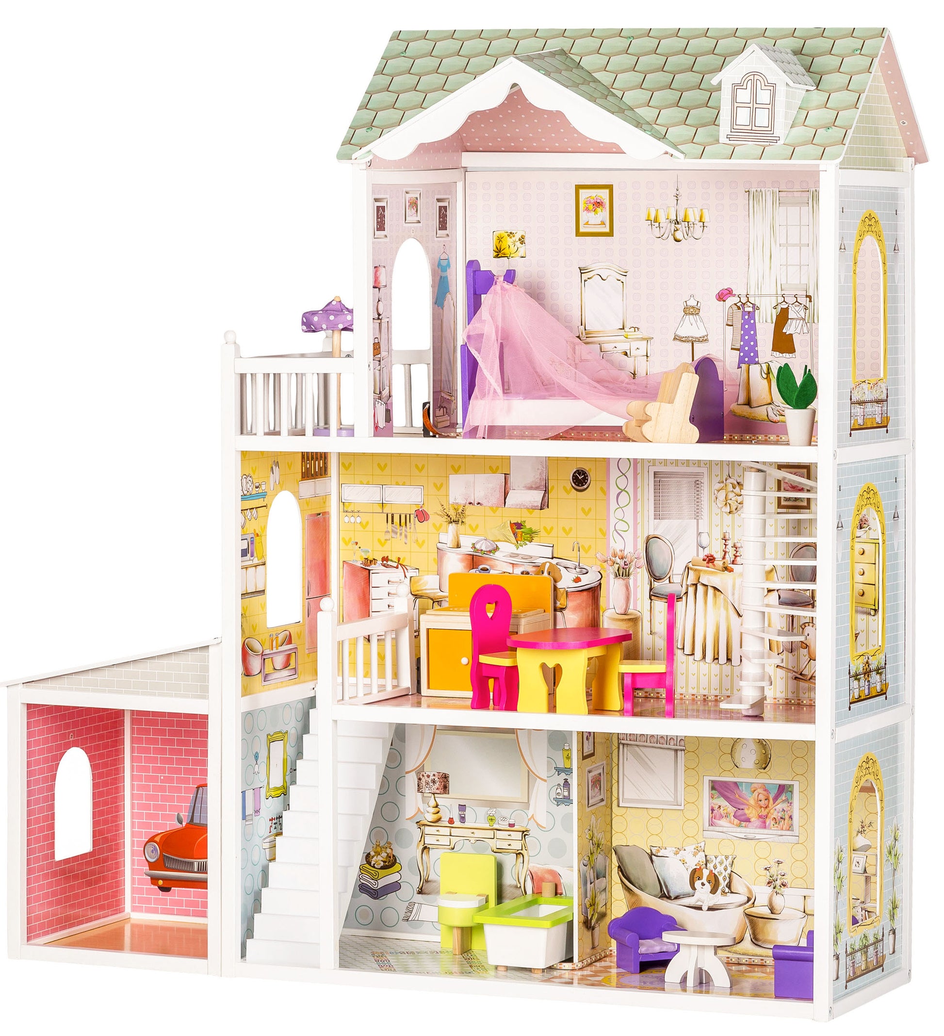 Casuta de papusi din lemn cu garaj idealSTORE MIAMI HOT RESIDENCE, Dimensiuni 124 x 38 x 114 cm, 3 nivele independente, 6 camere, un set de 13 piese mobilier si o papusa Barbie dezvolta distractia creativa