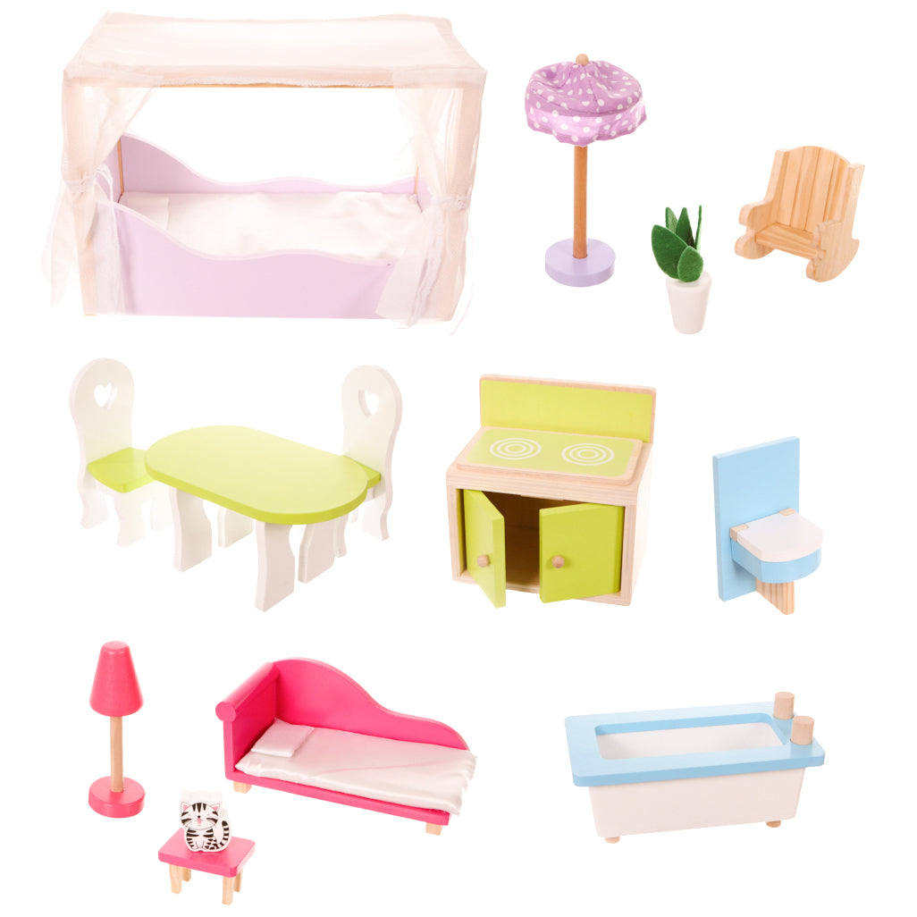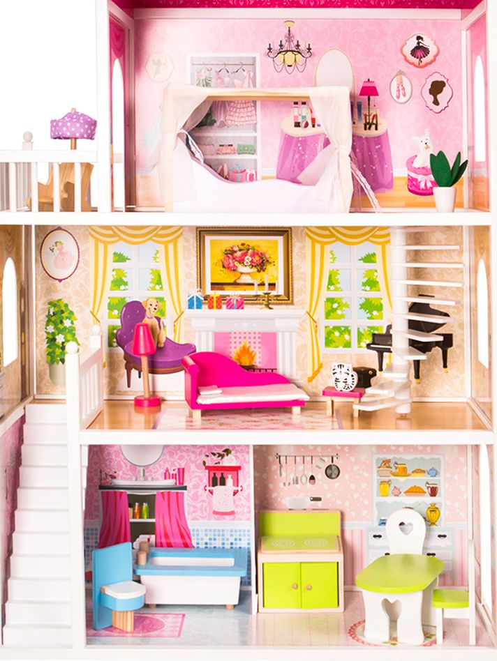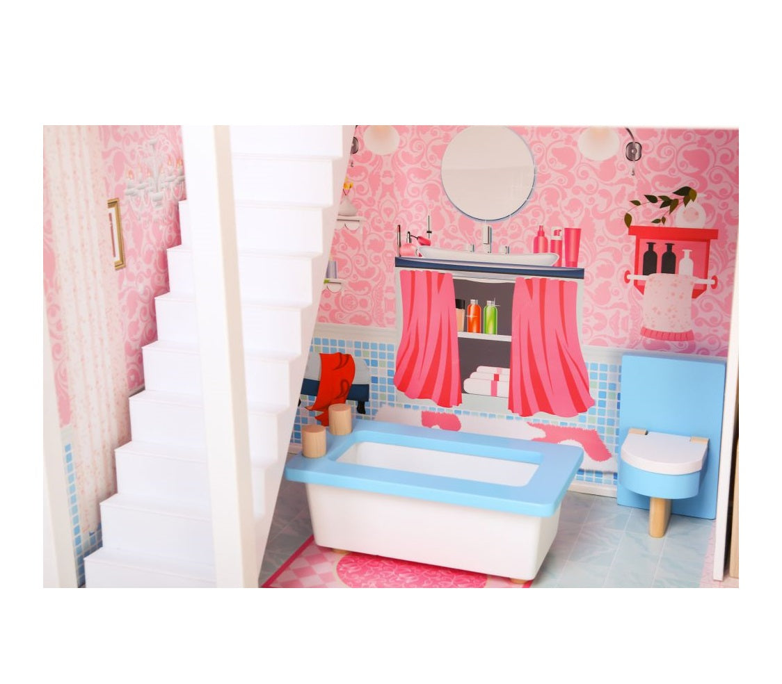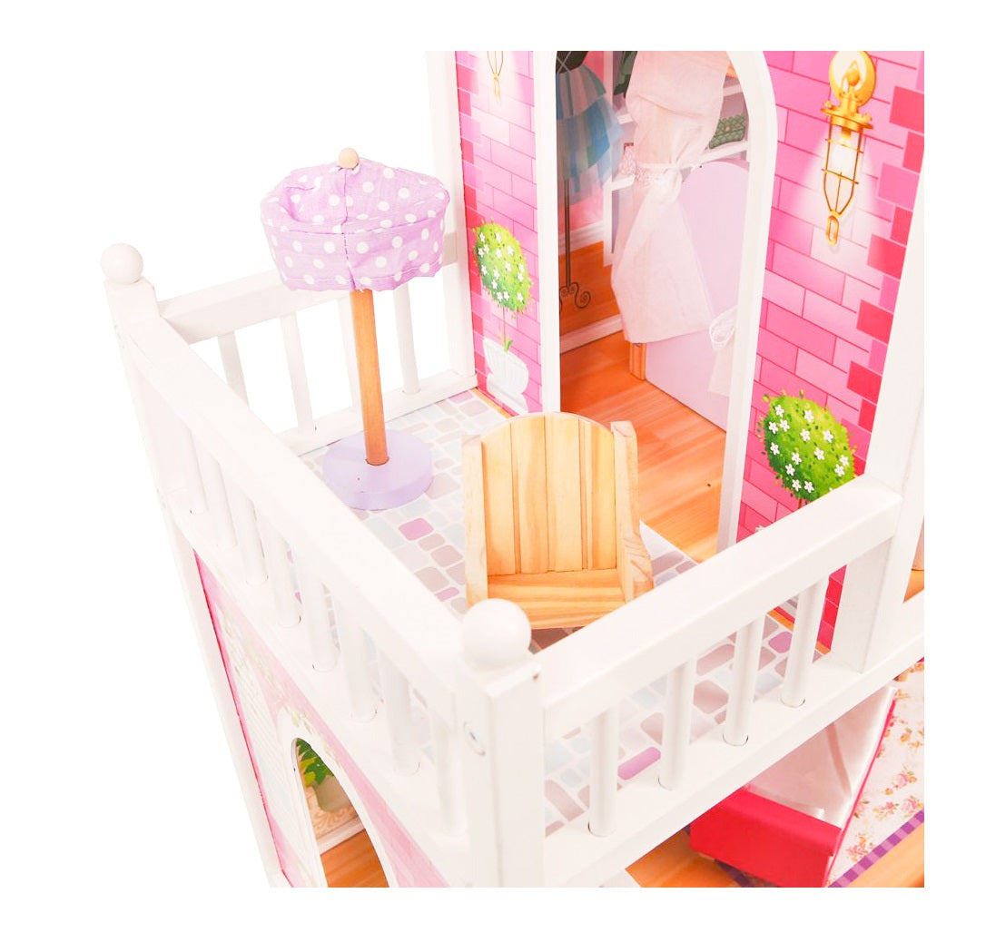 Casuta de papusi din lemn cu gradina idealSTORE MALTA BEAUTY RESIDENCE, Dimensiuni 124 x 38 x 114 cm, 3 nivele, 4 camere cu design minimalist, 14 piese de mobilier si 1 papusa creeaza o atmosfera de basm