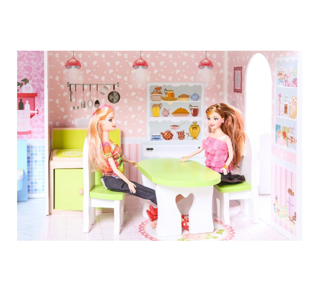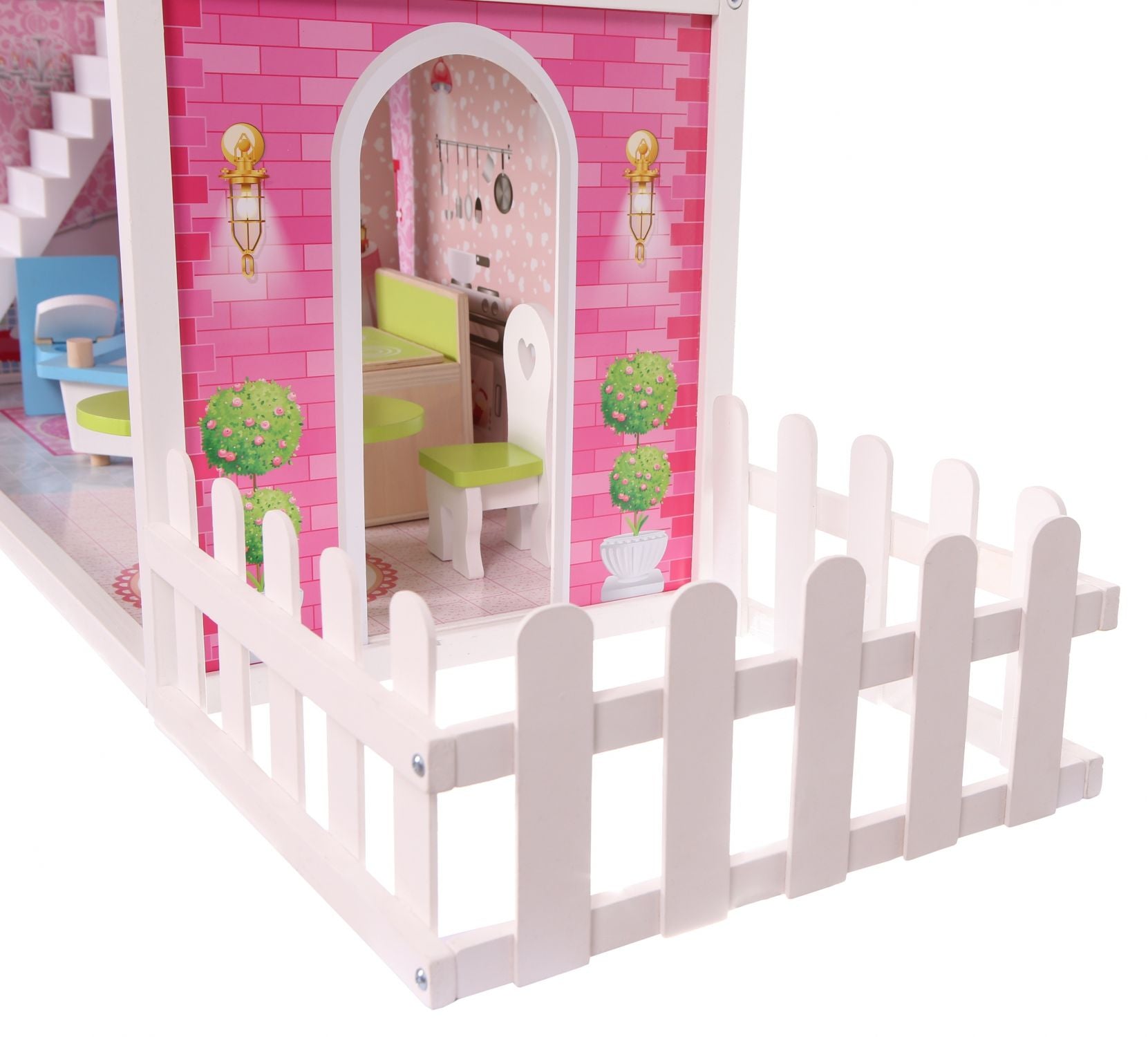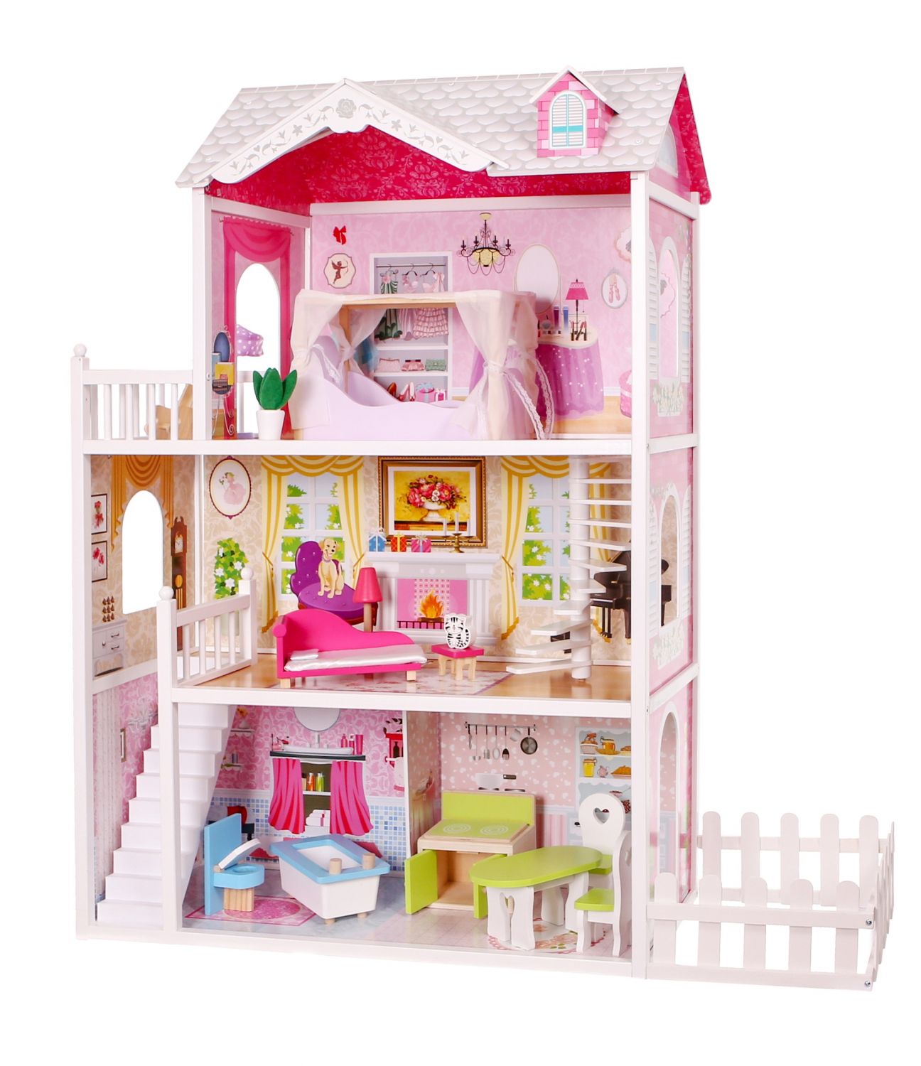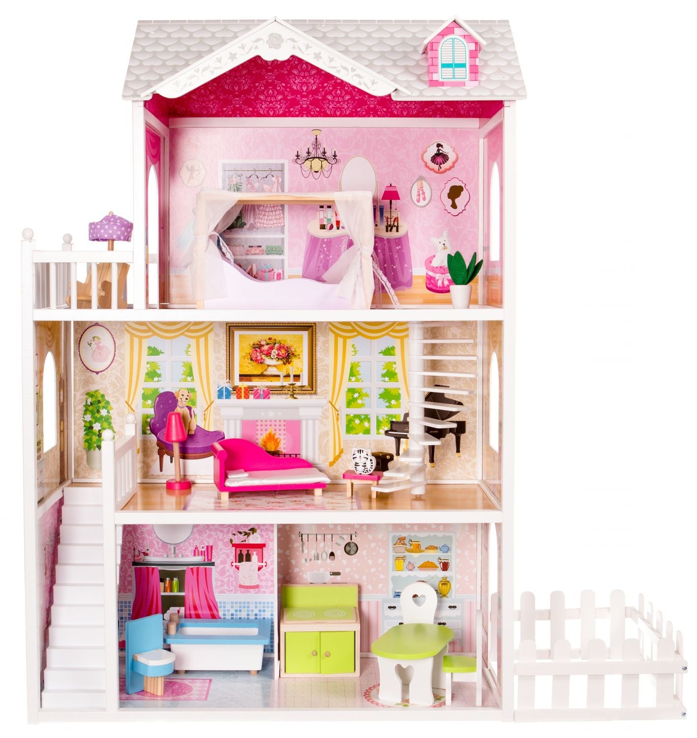 Casuta de papusi din lemn cu gradina idealSTORE MALTA BEAUTY RESIDENCE, Dimensiuni 124 x 38 x 114 cm, 3 nivele, 4 camere cu design minimalist, 14 piese de mobilier si 1 papusa creeaza o atmosfera de basm