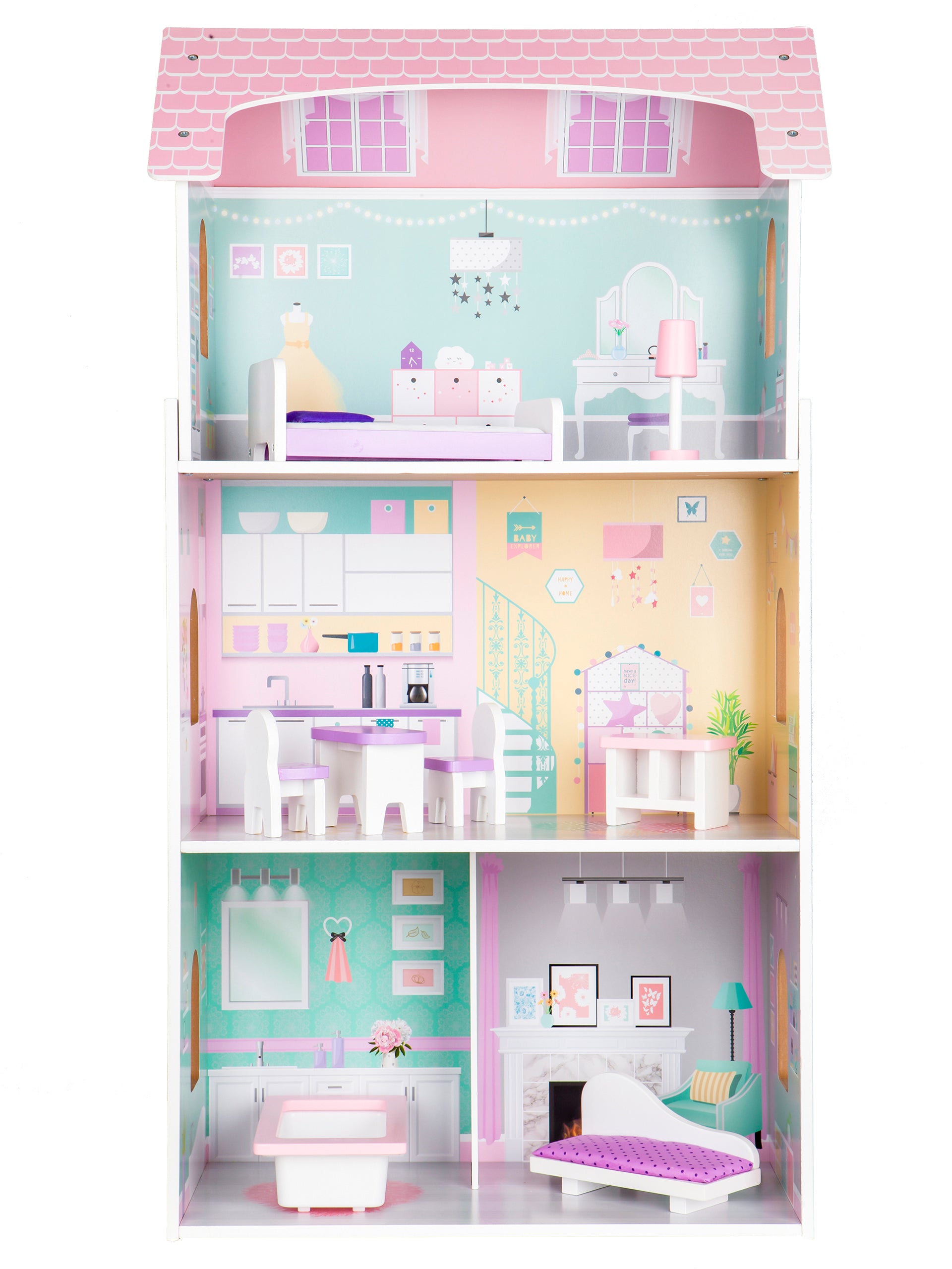 Casuta de Papusi din LEMN idealSTORE, Lovely Purple Princess, Dimensiuni 53 x 27 x 95 cm, Construita pe 3 niveluri cu 4 camere, Accesorizata cu mobilier ce imita perfect o adevarata casa rezidentiala