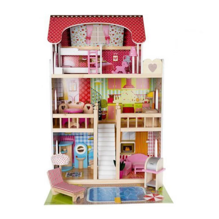 - SPATIOS - o casa de papusi din lemn este conceputa pentru o familie de 4 papusi. Are 3 nivele care sunt conectate intre ele printr-o frumoasa scara alba, cu pana la 5 camere + balcon si gradina cu piscina. Fiecare papusa viseaza la o casa atat de mare!