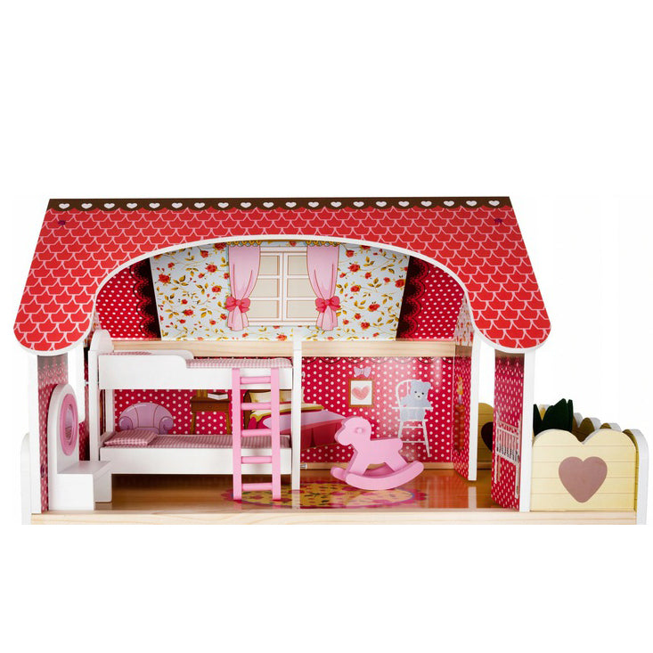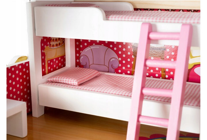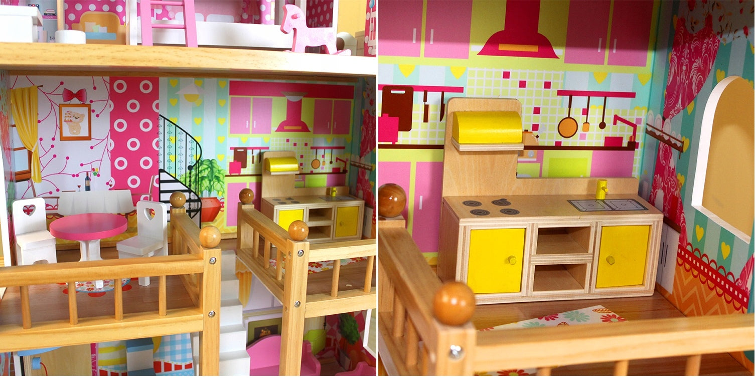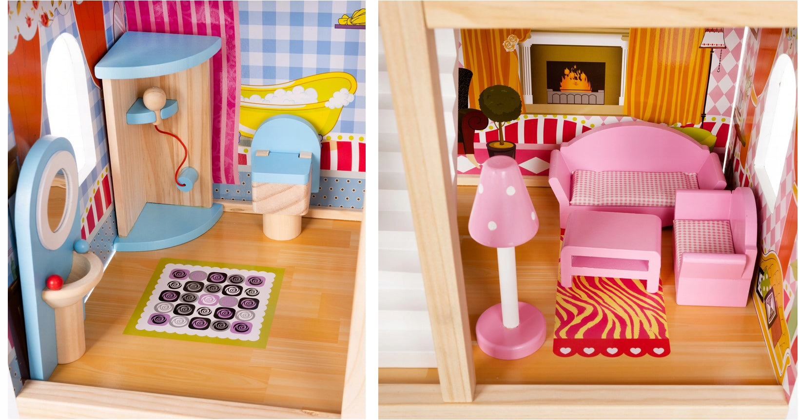 Casa de papusi din lemn ce va atrage orice fetita dar si orice privire atat prin intermediul culorilor sale vii cat si a camerelor dragute dar si mobilate.