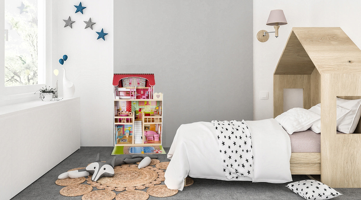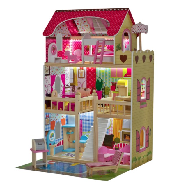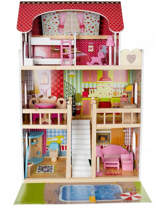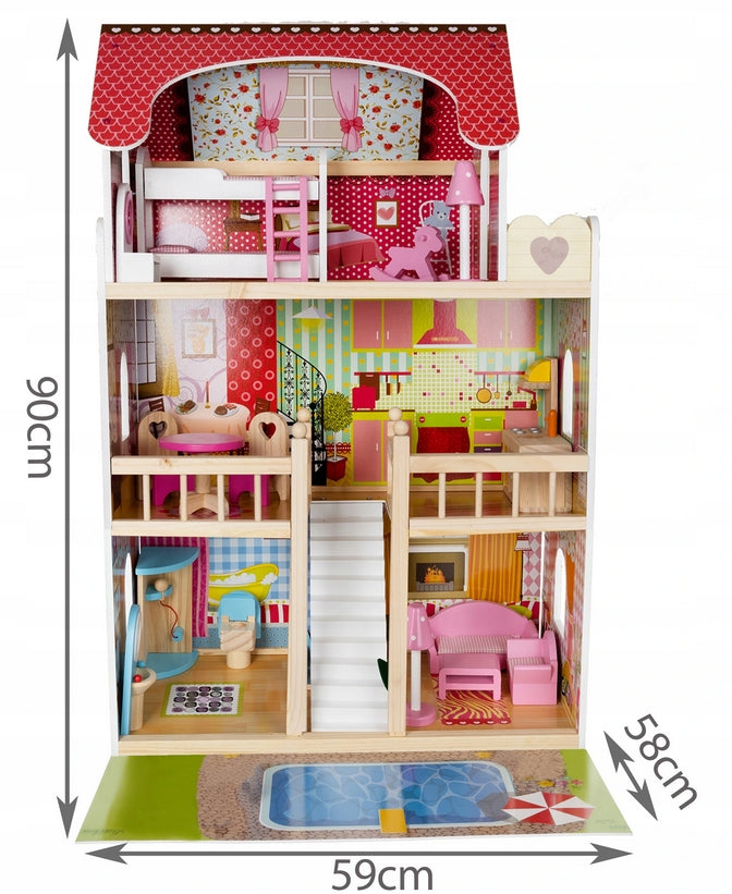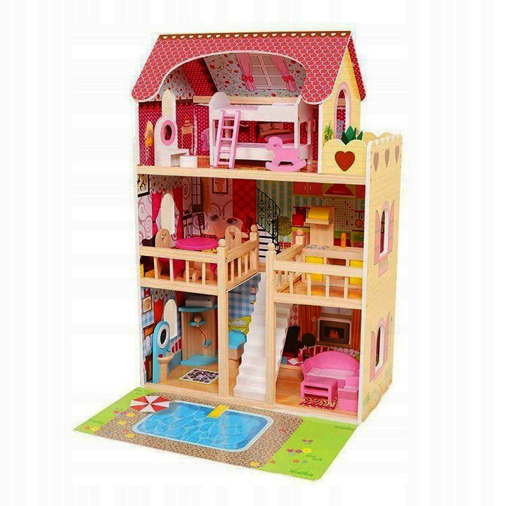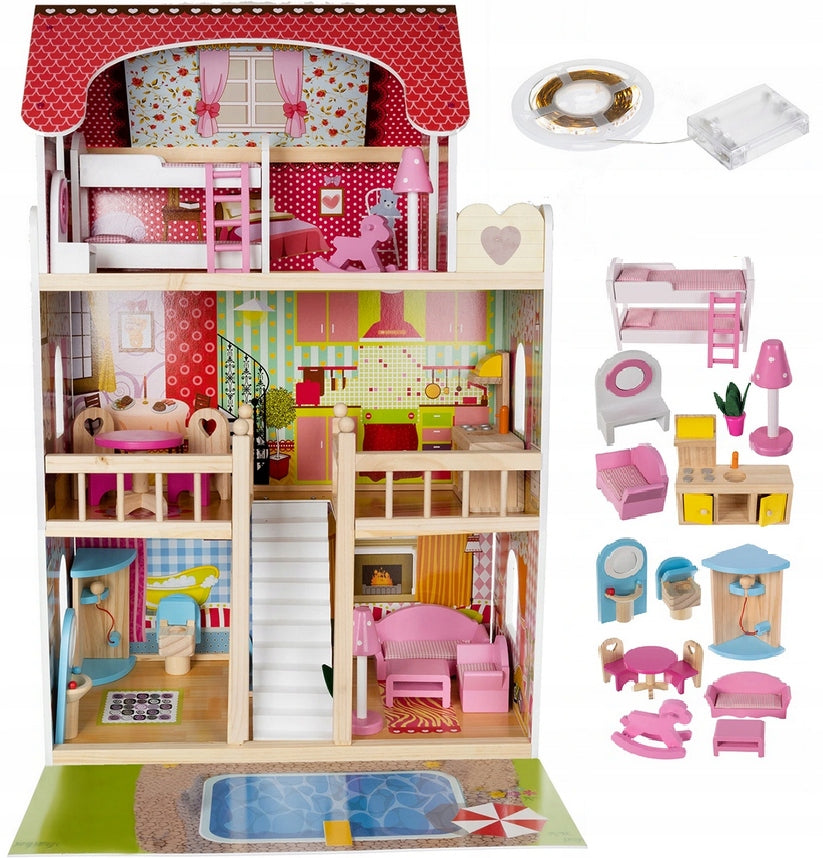 Casuta de papusi din lemn, Zola®, complet mobilata, 3 etaje, cu piscina, sezlong si gratar, iluminata LED, 90 cm