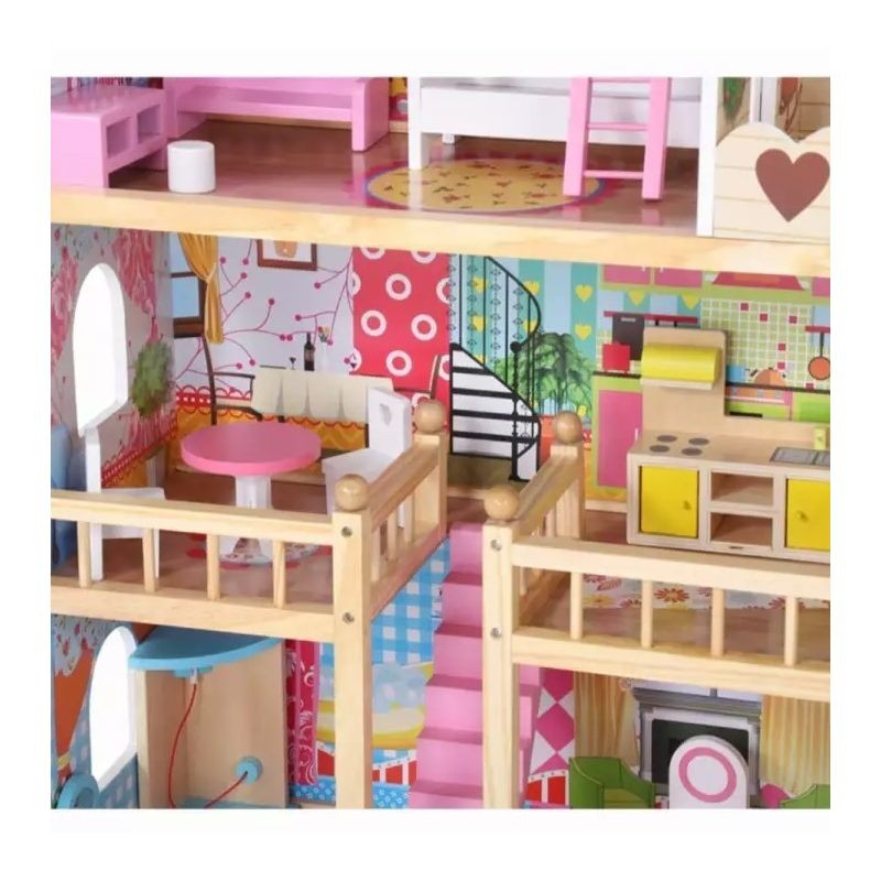 Achizitionati pentru cea mica o casuta realizata din lemn, structurata pe 3 nivele cu un total de 5 camere si 12 piese de mobilier, un cadou deosebit pentru camera acesteia. Detaliile casutei, culorile alese si atentia acordata fiecarui element in parte ii confera jucariei un aspect realist, fiind o casuta completa pentru familia de papusi a fetitei. Casuta dispune de 3 etaje: parter, etajul 1, mansarda si are 5 camere, respectiv: baie, living, bucatarie, dining room si un dormitor cu balcon la mansarda, conectate printr-o scara roz din lemn.