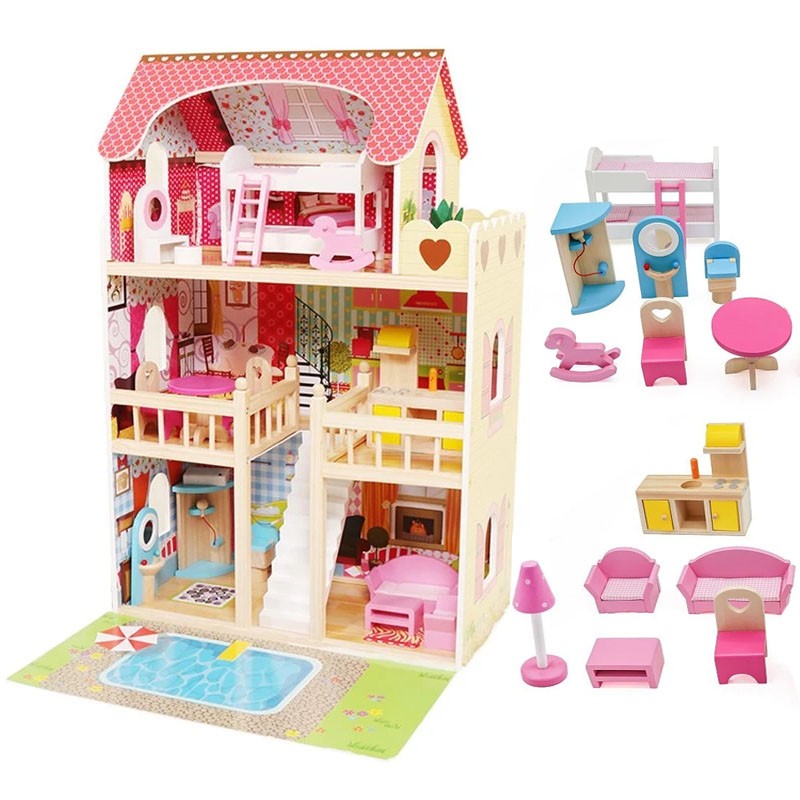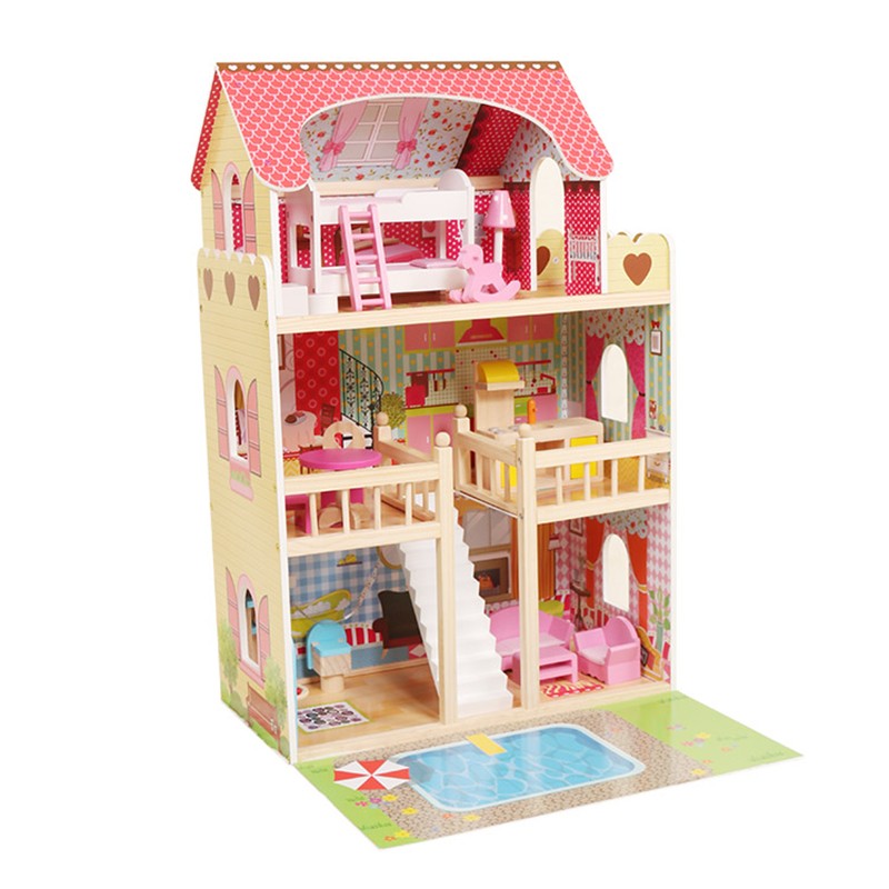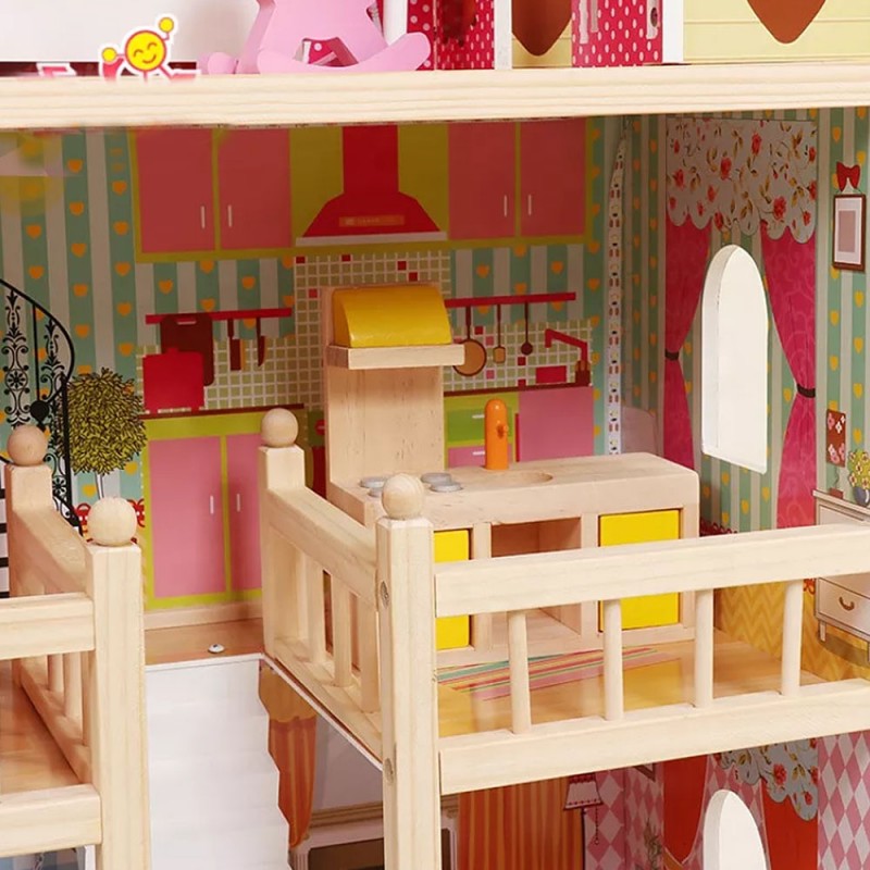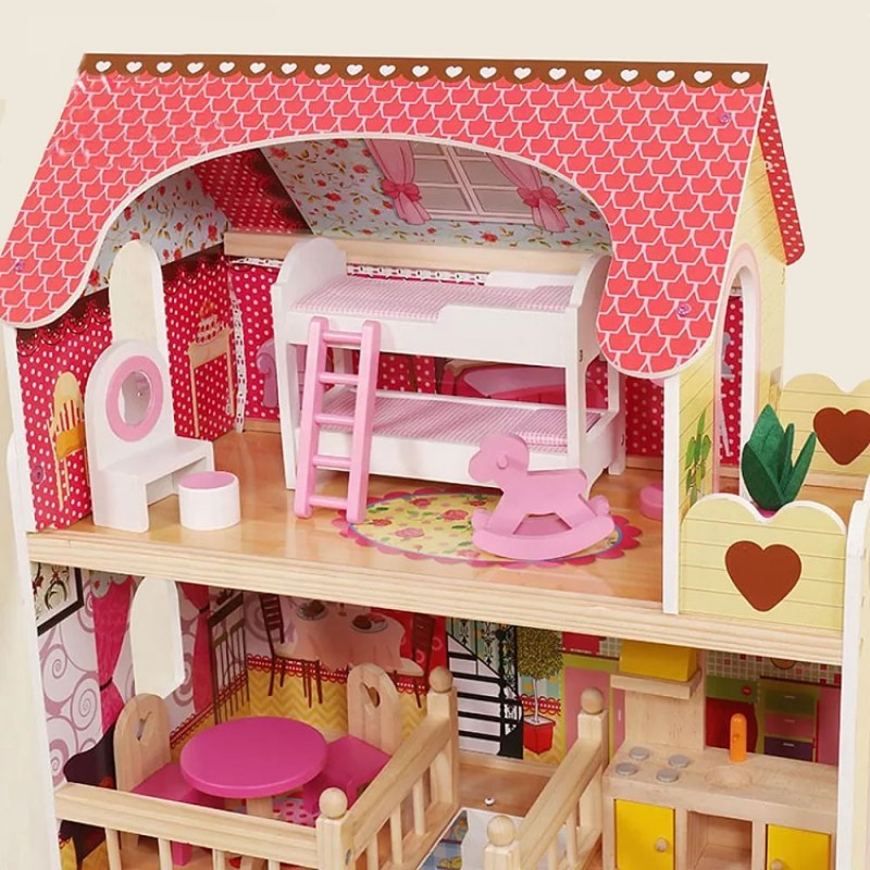 Casuta de papusi este structurata pe 3 nivele, avand 5 camere complet mobilate si utilate, un balcon la mansarda, o multime de piese de mobilier si accesorii care completeaza fiecare incapere. Este fabricata dintr-un lemn masiv, avand o constructie rezistenta si durabila. Lemnul are ilustratii colorate si este plin de detalii, fiind atent finisat astfel incat sa nu existe riscul de ranire. Toate elementele sunt prelucrate cu mare atentie, perfect lustruite, fiind sigure pentru copil.