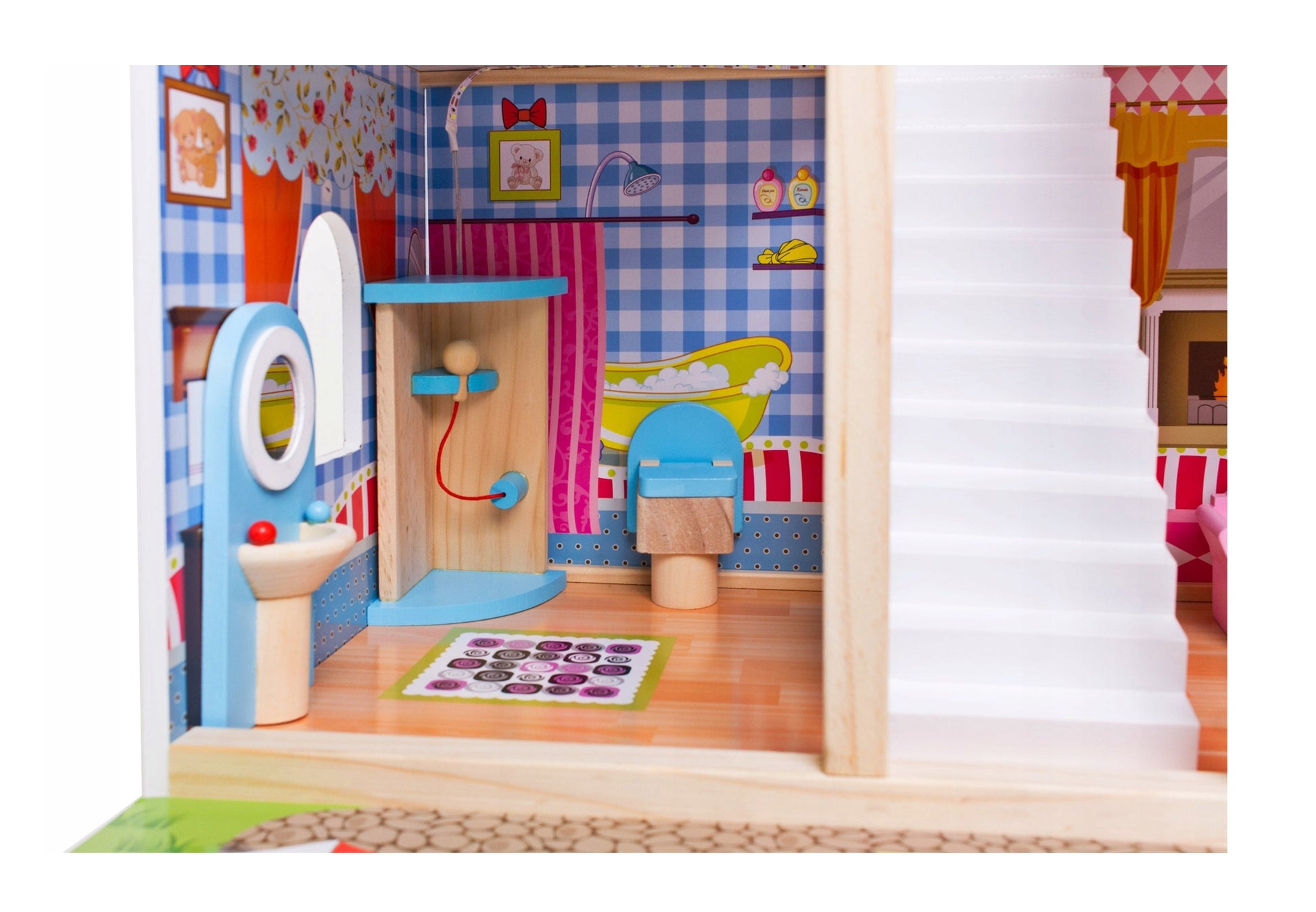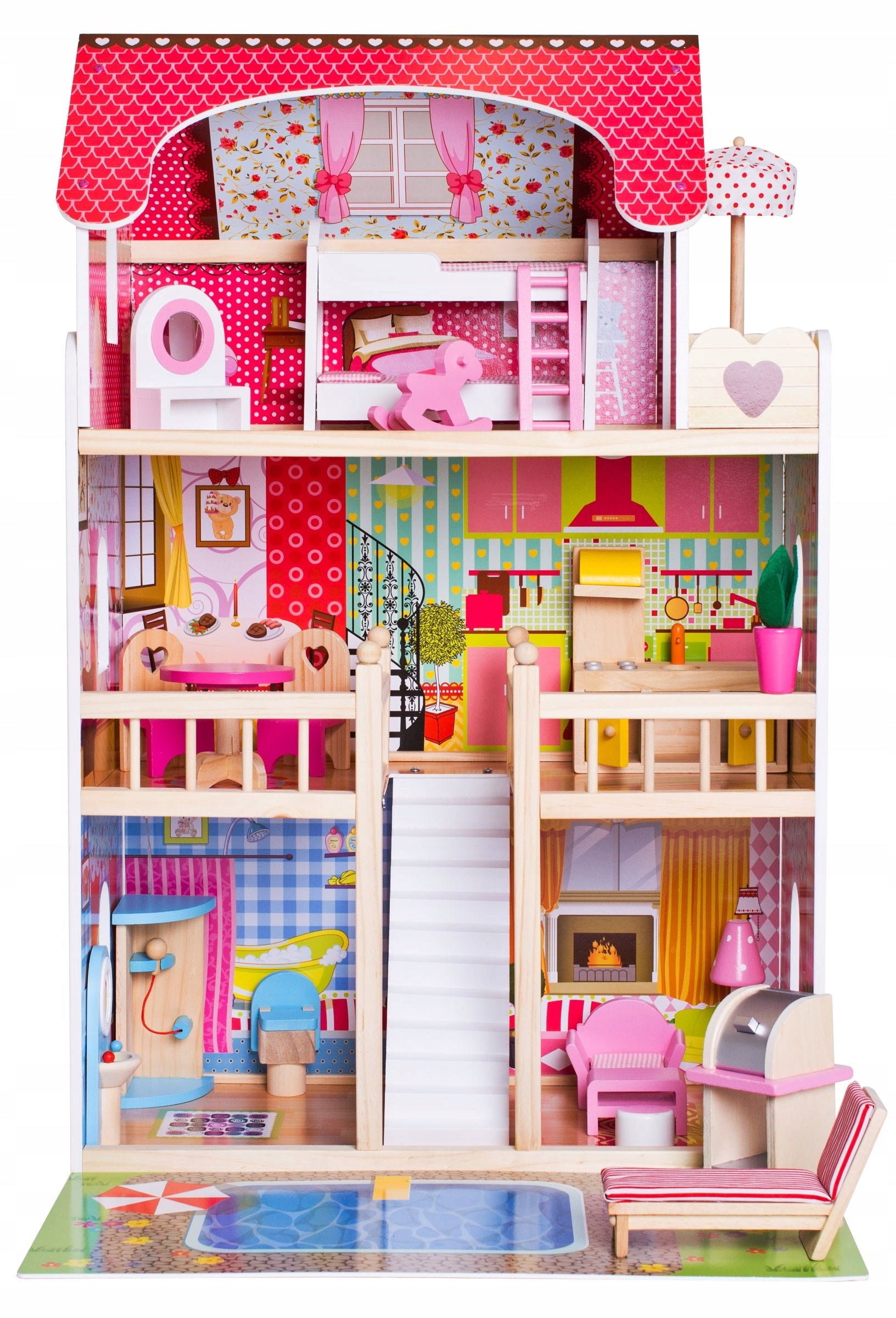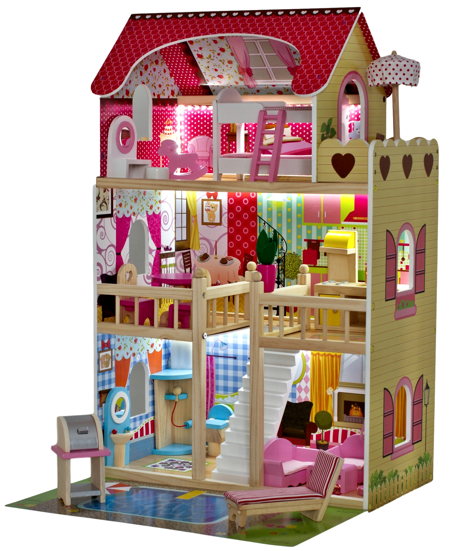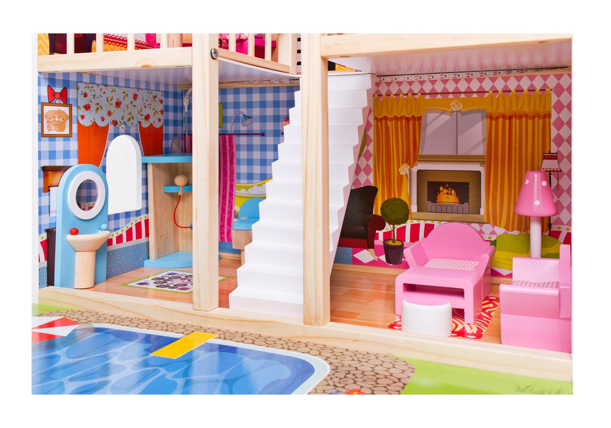 Casuta de papusi din lemn idealSTORE FABULOUS RESIDENCE, Accesorizata cu lumina LED, Dimensiuni 90 x 60 x 30 cm, Constructie pe 3 nivele, Include 3 camere, piscina si 14 piese de mobilier
