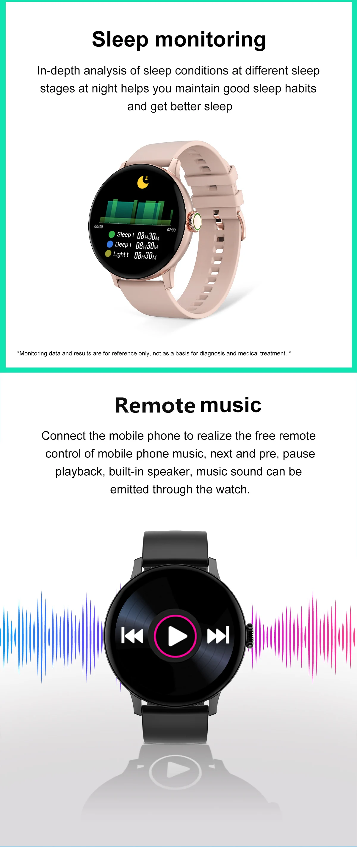 Ceasul inteligent este dotat cu functii de sanatate, are o functie de monitorizare a ritmului cardiac, de verificare a ritmului cardiac 24/7. De asemenea, este echipat cu monitorizare ECG cu PPG+ HRV. Functiile suplimentare incluse sunt monitorizarea somnului, oferind o analiza aprofundata a diferitelor etape de somn, de la timpul somnului, somnul profund pana la somnul usor.