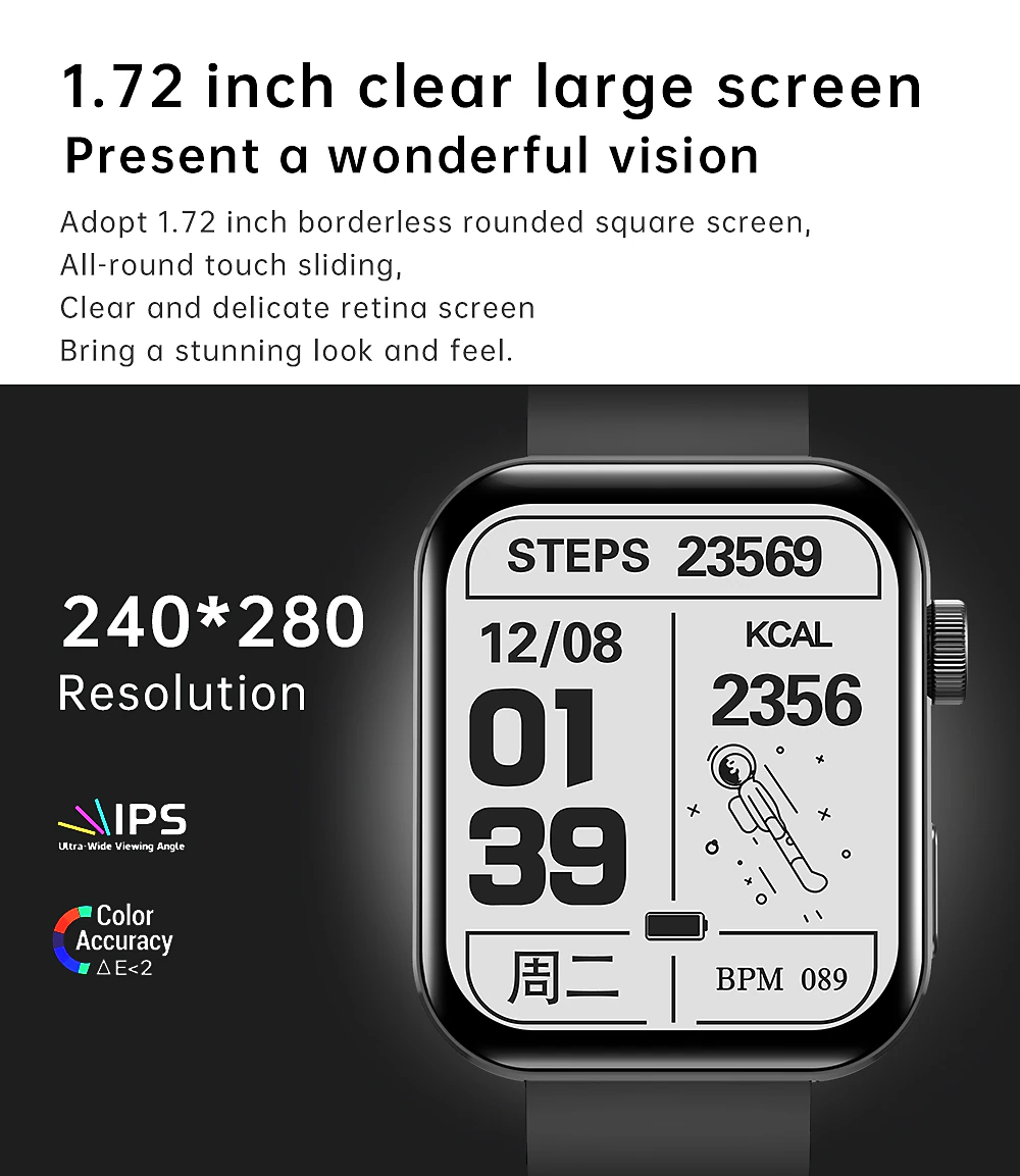 Corpul smartwatch-ului este realizat din aliaj de zinc, in timp ce cureaua este disponibila in silicon. Referitor la ecranul de afisare! Acest ceas inteligent foloseste un ecran tactil TFT de 1,72 inchi creat cu o rezolutie de 240 x 280 pixeli. Acest ceas inteligent este, de asemenea, ambalat cu o varietate de fete de ceas si este disponibil in culorile negru, roz si alb.