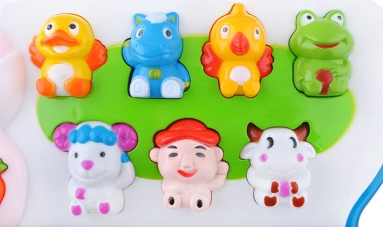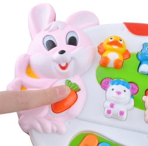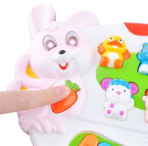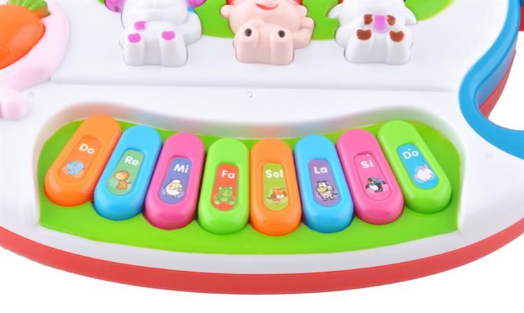 LED-urile stralucitoare in pian cu sunetele animalelor ajuta copilul sa se concentreze asupra jucariei.