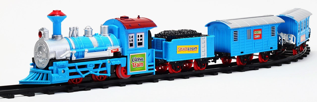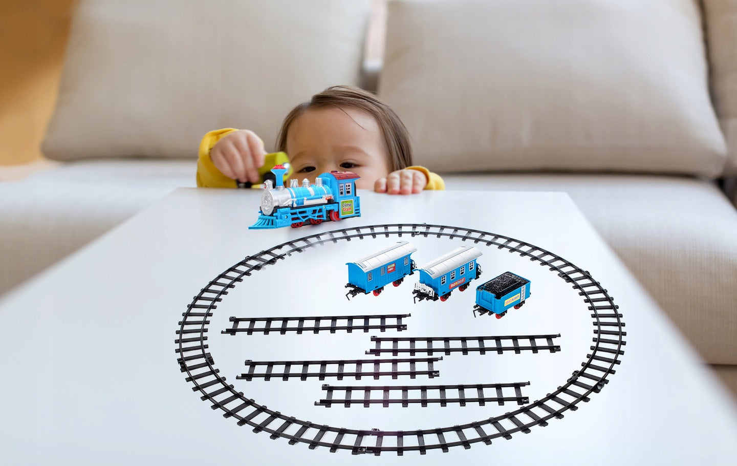 - Centru de activitati si Puzzle Trenuletul Micul Calator , Model interactiv cu diverse accesorii pentru o distractie garantata cu 1x locomotiva (20cm), 2x pat carucior (15cm), vagon de marfa (12cm), 6x sina diagonala (39cm), 4x sine simple (30cm).