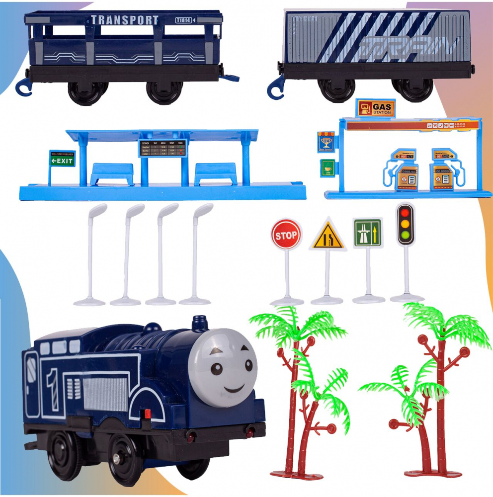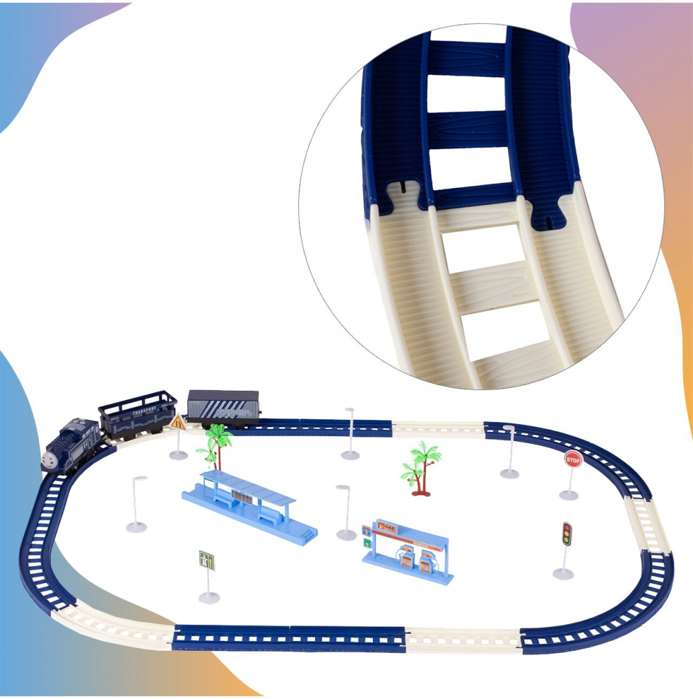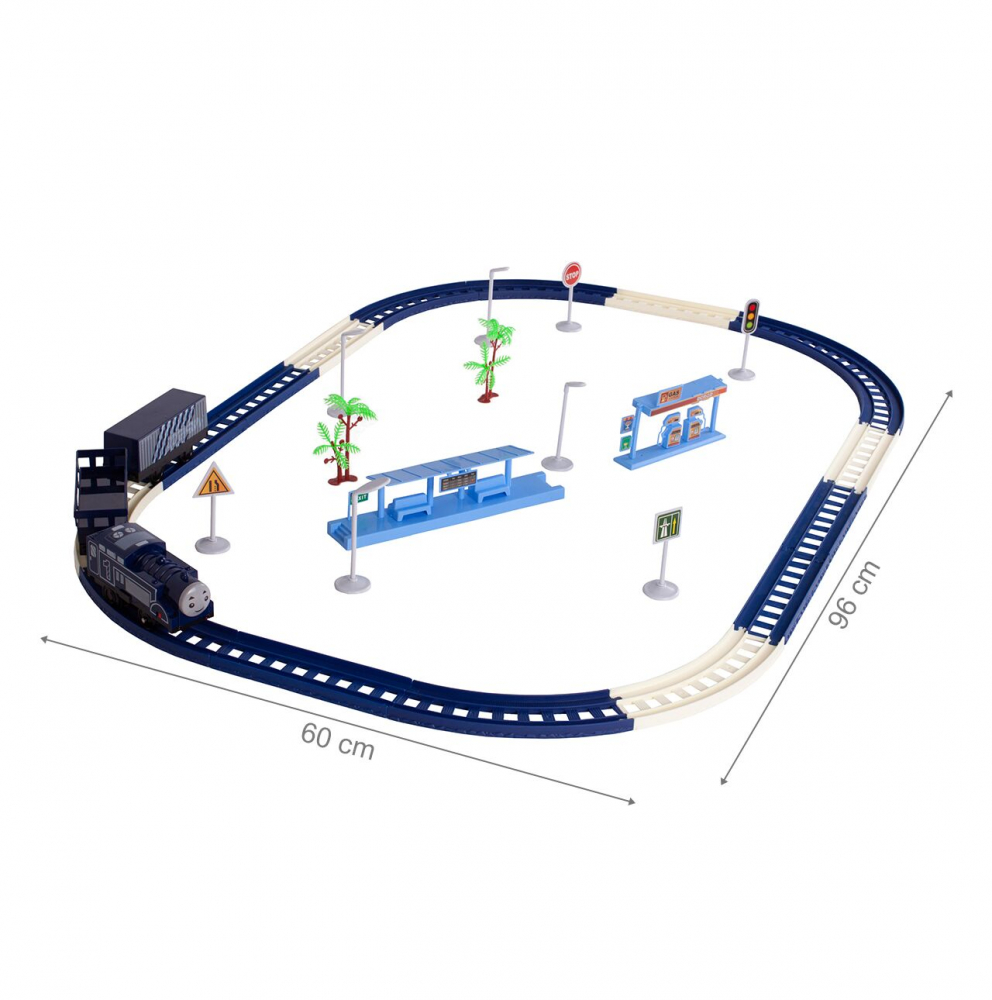 Circuit Electric cu Tren Railway High Speed idealSTORE, Accesorizat cu Sunete si Lumini, Include Trenulet, 2 Vagoane, Benzinarie, Platforma, 4 Lampi, 2 Copaci, 4 Indicatoare, 16 Elemente pentru a Crea o Pista, Lungime Pista 224 cm