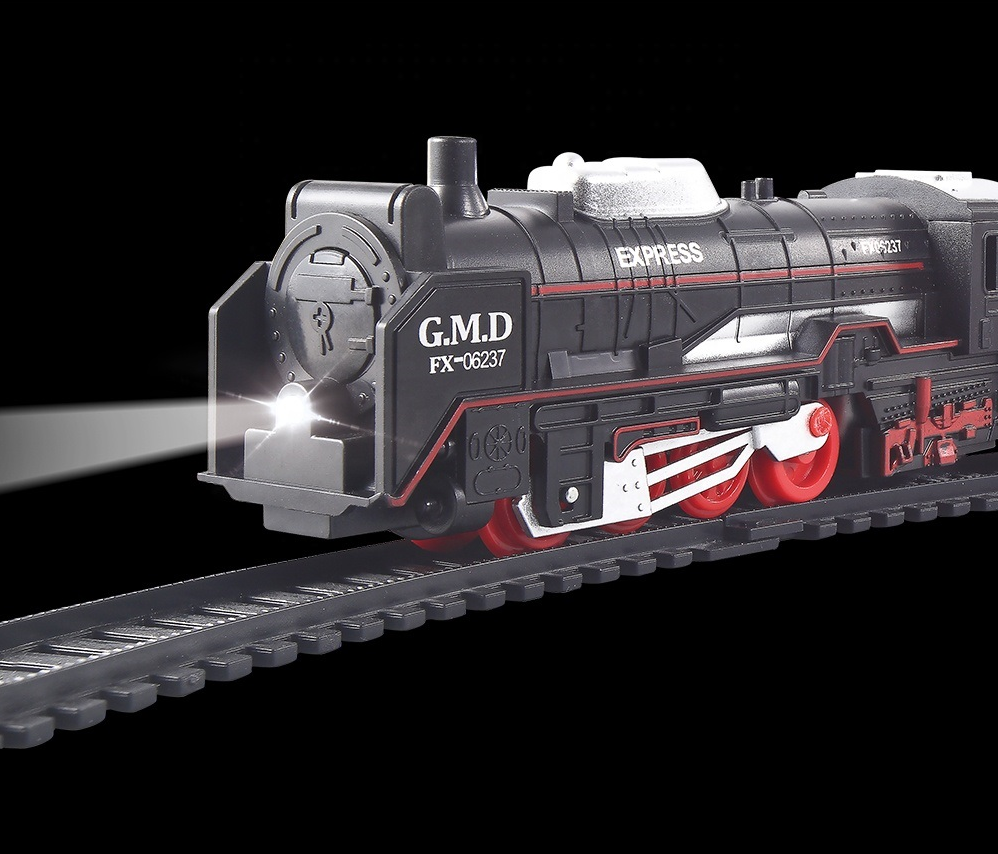 Circuit Electric cu Tren Vintage Train idealSTORE, Include o Locomotiva Echipata cu Lumini ce lumineaza Directia de mers, 2 Vagoane de Marfa, Ofera ore intregi de distractie