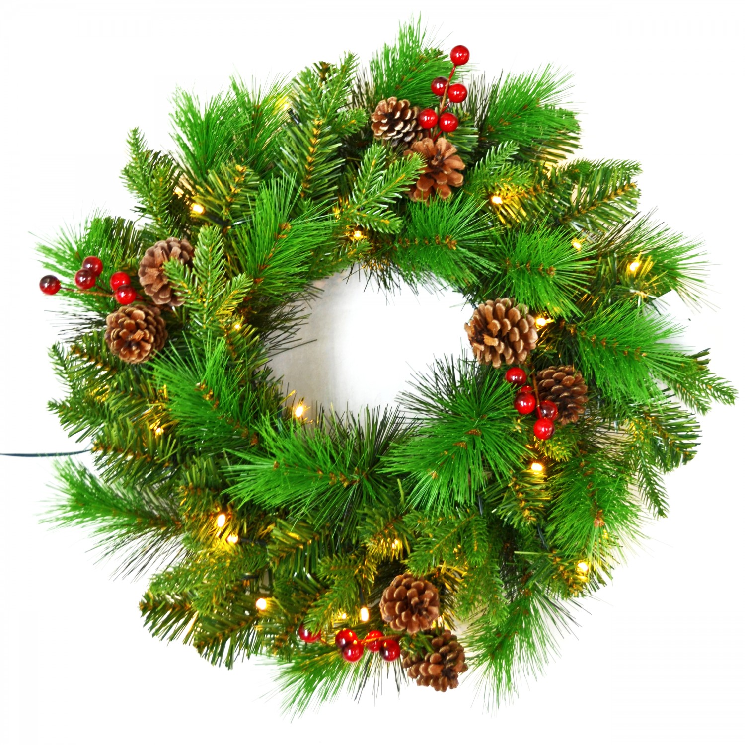 Coronita decorativa IDL Green Fest , 50 de led-uri cu lumina calda, 60 cm, Confectionata din 200 varfuri de brad artificial de culoare verde ce creeaza un spatiu de poveste in preajma Sarbatorilor, Funtionalitate pe baterii