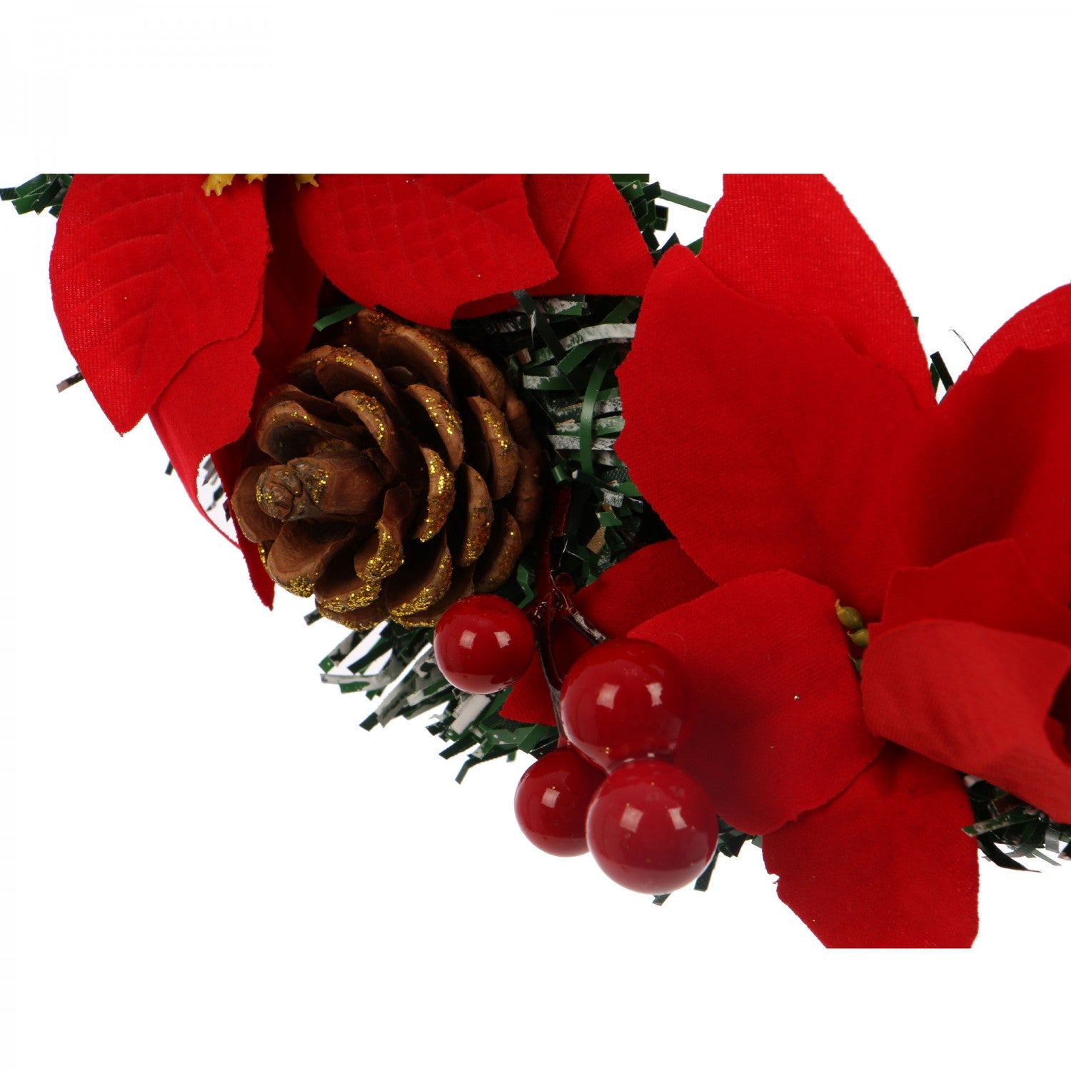 Coronita decorativa IDL Red Christmas, 30 cm ce creeaza un decor in spiritul sarbatorilor de iarna, Alcatuita din elemente simbolice: crengute de brad, flori, conuri si fundita in combinatia cromatica de verde si rosu