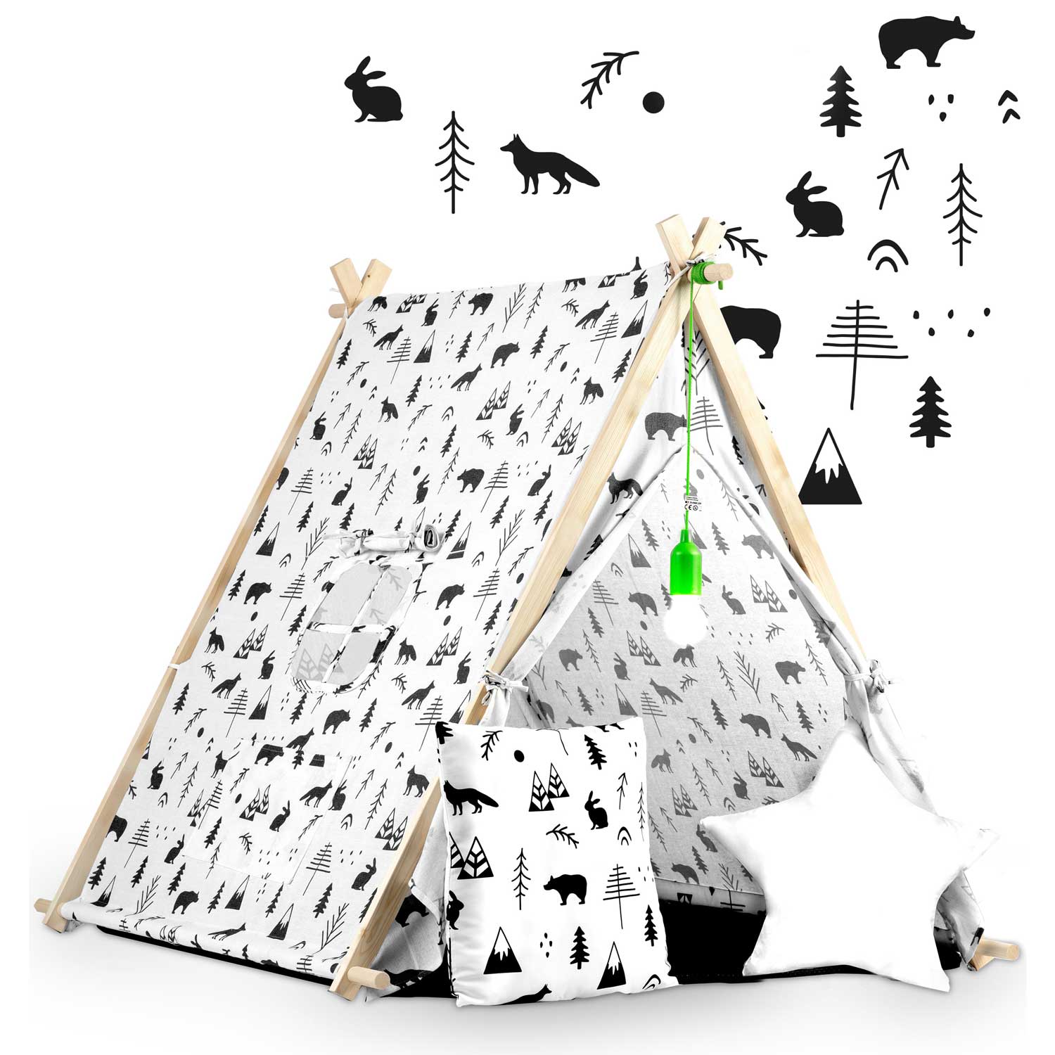 Cort de Joaca cu Lumini idealStore TIPI, model Tipi, Bumbac Natural, cu Perne, Covoras Izolator, Structura Stabila, Pereti Glisanti, Husa de Depozitare, Desen Animalute