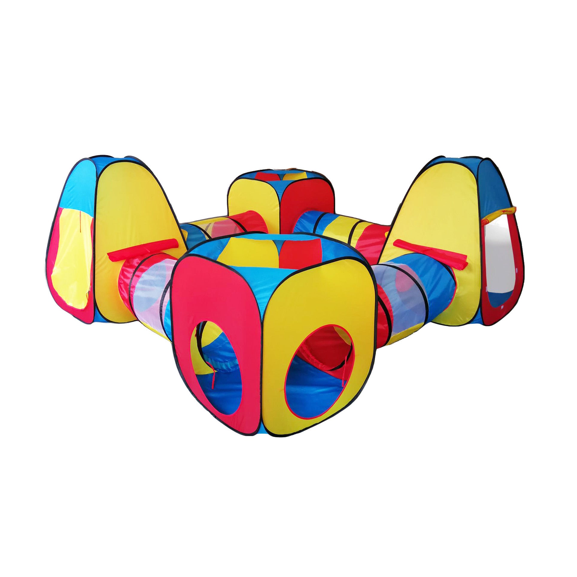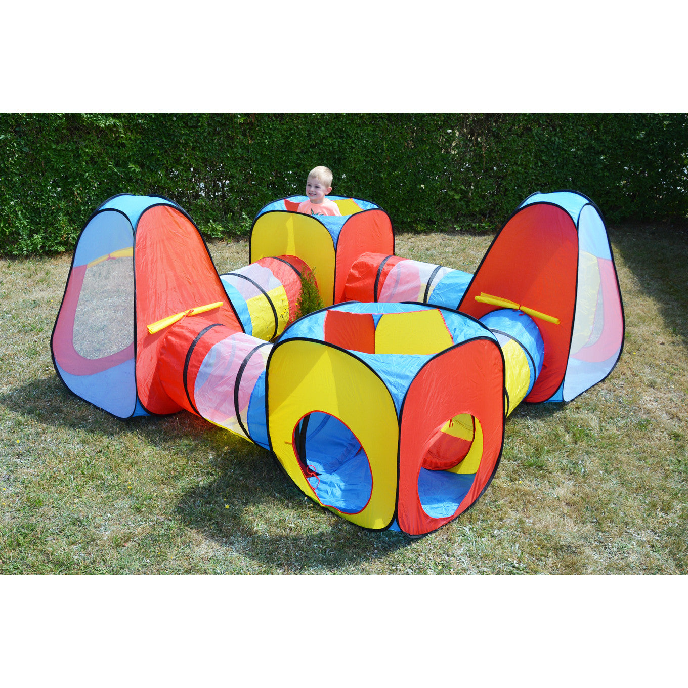 Cortul spatios are 8 elemente intr-unul singur! Construit din 4 tunele si 4 corturi in diferite forme, el formeaza un intreg sau poate fi impartit, fiecare oferind multa distractie. Cortul este destinat in principal distractiei pentru mai multi copii. Va fi minunat in timp ce petreceti timp liber acasa, dar si in aer liber.